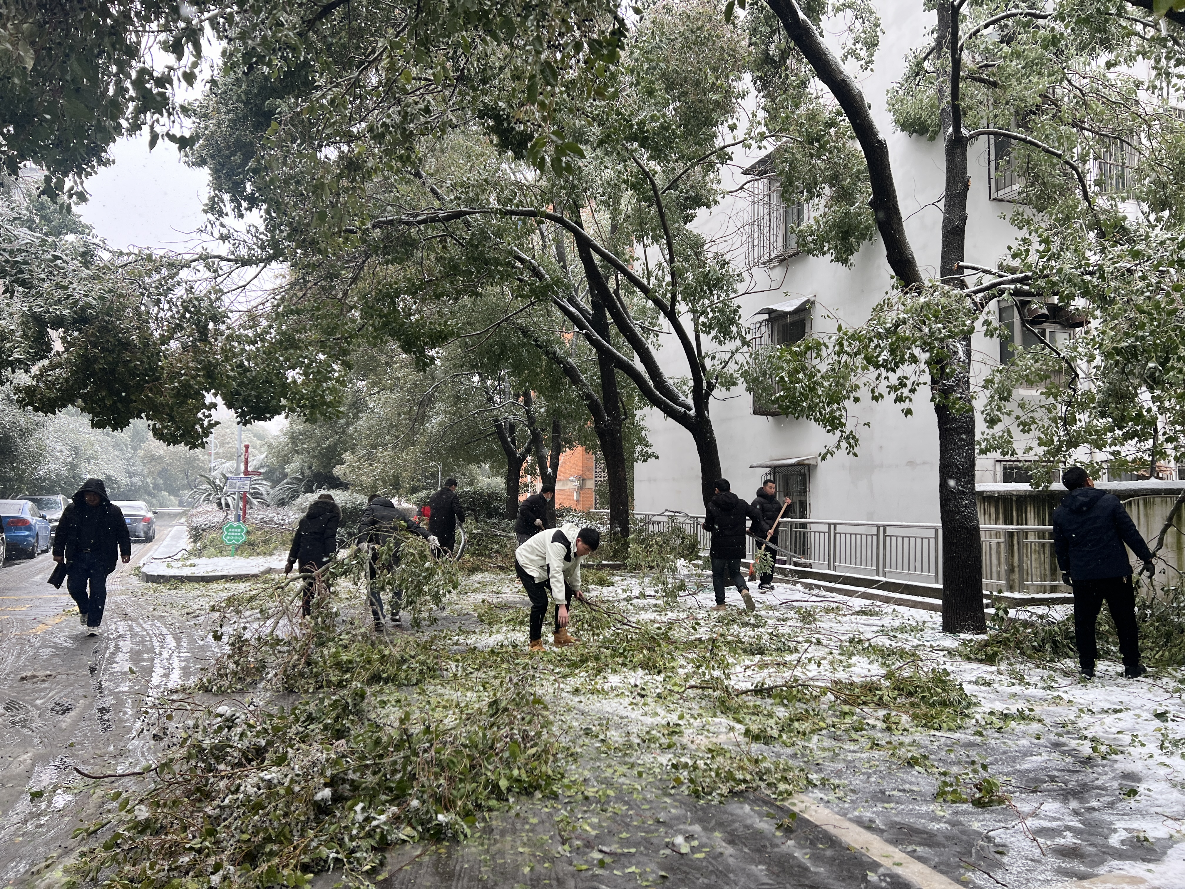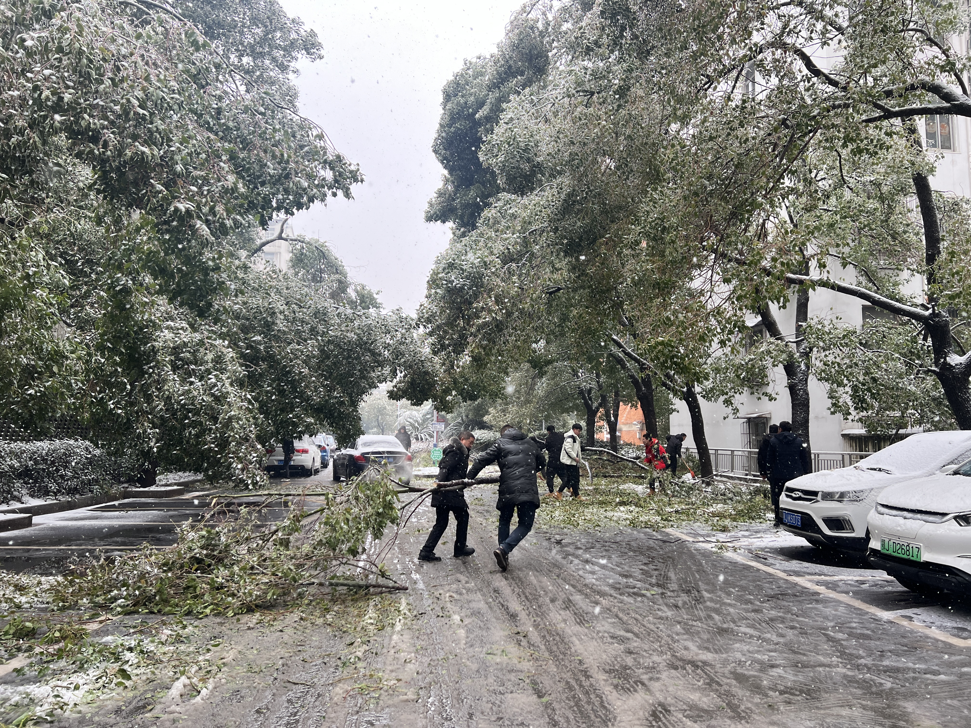 2024年2月4日,黃州城區(qū)遭遇凍雨和暴雪雙重襲擊,八一路辦公樓、宿舍區(qū)路面全被雪覆蓋,樹(shù)枝倒塌,攔住車(chē)輛通行的道路,危及行人安全。