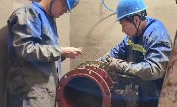 3月27日,二水廠老水池排污閥處,六七名職工渾身油漬和泥濘,圍在滿是污泥的排污閥門面前,拆螺絲、吊閥門、安皮墊……熱火朝天地更換老水池排污角閥。