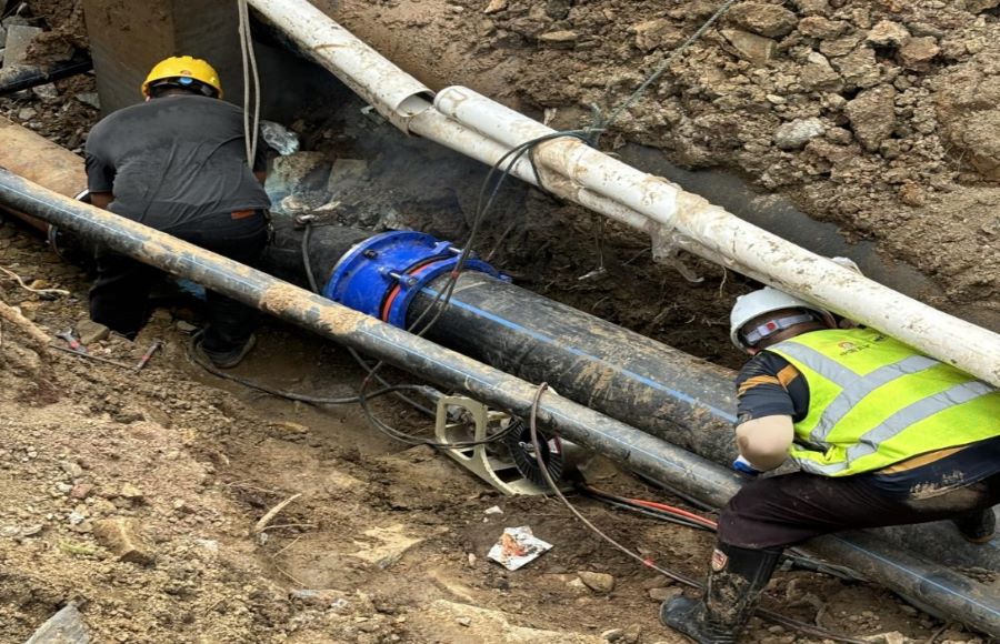 21日一大早,維修人員到場,人工挖掘直到中午才挖出漏水管道,不得不說管網(wǎng)所同志技術(shù)扎實,定位精準(zhǔn)。按照定位下挖發(fā)現(xiàn)300管道因為地質(zhì)下沉,受到擠壓完全變形,法蘭撕裂開導(dǎo)致漏水。因為受損管道角度異常,修理比較復(fù)雜。管網(wǎng)管理所、黃州供水營業(yè)所,生產(chǎn)管理中心積極到場研究維修方案,方案確定以后,管網(wǎng)管理所開來大型設(shè)備維修車輛,帶來維修材料。由于準(zhǔn)備啟用備用水源管道,為防止水質(zhì)出現(xiàn)問題,水質(zhì)檢測部門也趕到現(xiàn)場進(jìn)行水質(zhì)檢測。