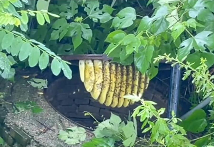 然而,當(dāng)工作人員到達(dá)支線閘門井處時(shí),發(fā)現(xiàn)閘門井蓋內(nèi),有野蜂群在井內(nèi)筑構(gòu)了一個(gè)橄欖球大小的蜂巢,飛舞的野蜂們具有極強(qiáng)的攻擊性,遇到雨水的影響更是變得極為兇猛,致使工作人員無法靠近閘門,嚴(yán)重阻礙了維修工作的進(jìn)展。這一情況,讓一心想搶修閘門的工作人員們心急如焚,但又不知所措。
