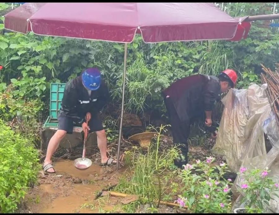此時(shí),工作人員們迅速調(diào)整好復(fù)雜的情緒狀態(tài),考慮到漏水點(diǎn)較大,顧不上瓢潑大雨,支撐起遮雨傘后,利用周邊可利用的物品,制作簡(jiǎn)易的防蜂裝備。待臨時(shí)做好了防蜂措施后,工作人員們小心翼翼地將蜂巢從井內(nèi)移除,并關(guān)閉支線閘門停水。隨后,立即趕往漏水處,開展維修工作。