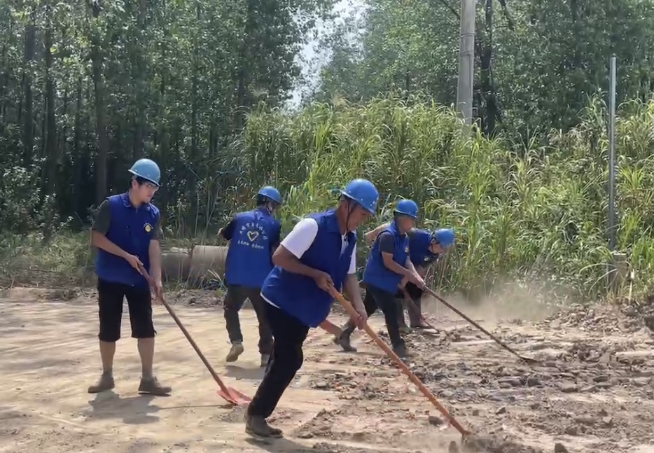 當天,尹俊帶領(lǐng)大家扛著鐵鍬和鐵鎬等工具開始清理一泵站道路上的淤泥。大家你一鍬、我一鍬把道路上的淤泥鏟到路牙旁邊的叢林中。高溫炙烤下,大家汗流浹背,黨員身先士卒,不怕臟不怕累,不懼炎熱,揮舞著手中的鐵鍬,有的用鐵鎬把暴曬后堅硬無比的泥土一塊一塊鑿開,志愿者們也是一片忙碌,現(xiàn)場是一派熱火朝天,干勁十足的勞動情景。