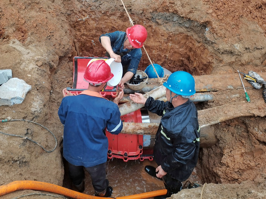 極端天氣下,保障市民用水刻不容緩。管網(wǎng)管理所搶修人員迅速對赤壁大道舟橋五營DN400砼管展開搶修,爭分奪秒恢復管道運行;組織勞務分包單位維護保養(yǎng)勝利街、七一路蝶閥,消除供水隱患。