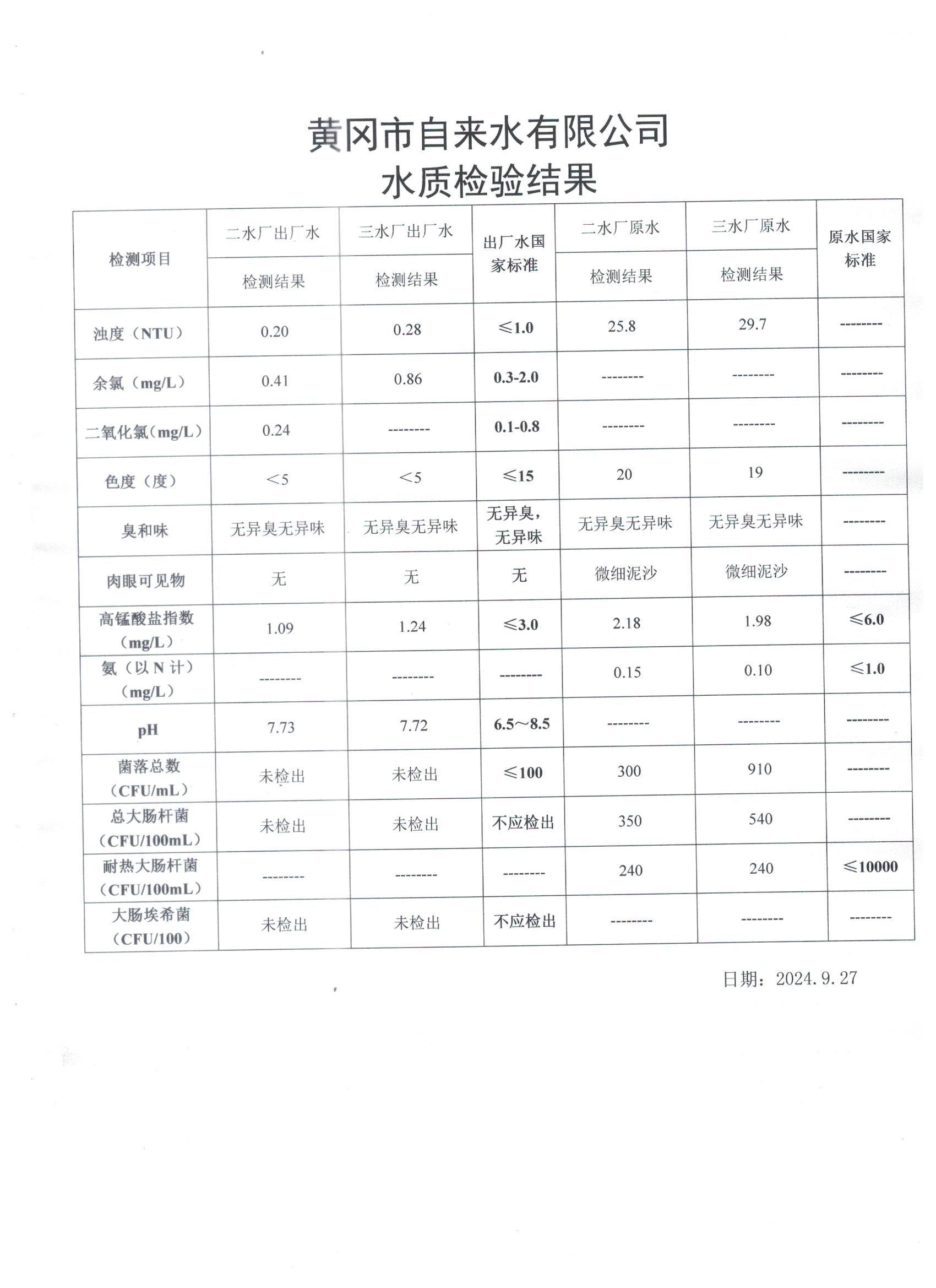2024年9月27日水質(zhì)檢測(cè)日?qǐng)?bào)表