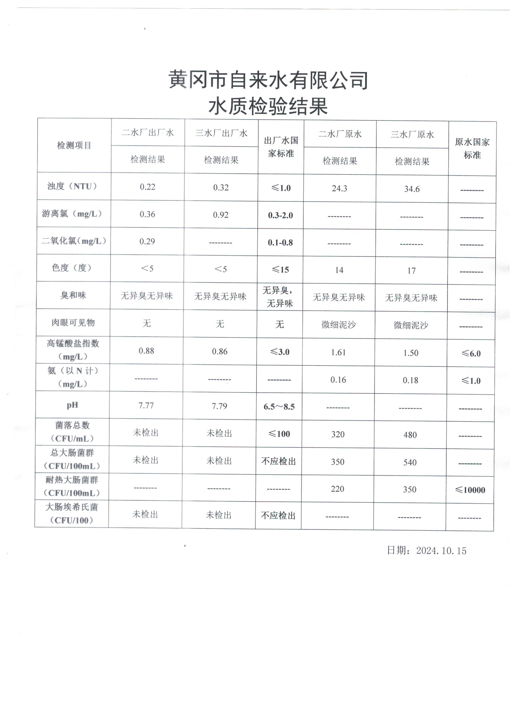 2024年10月15日水質(zhì)檢測(cè)日?qǐng)?bào)表