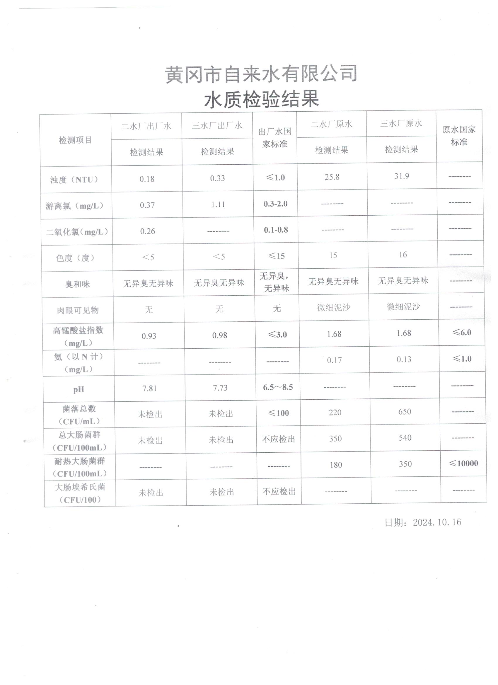 2024年10月16日水質(zhì)檢測(cè)日?qǐng)?bào)表