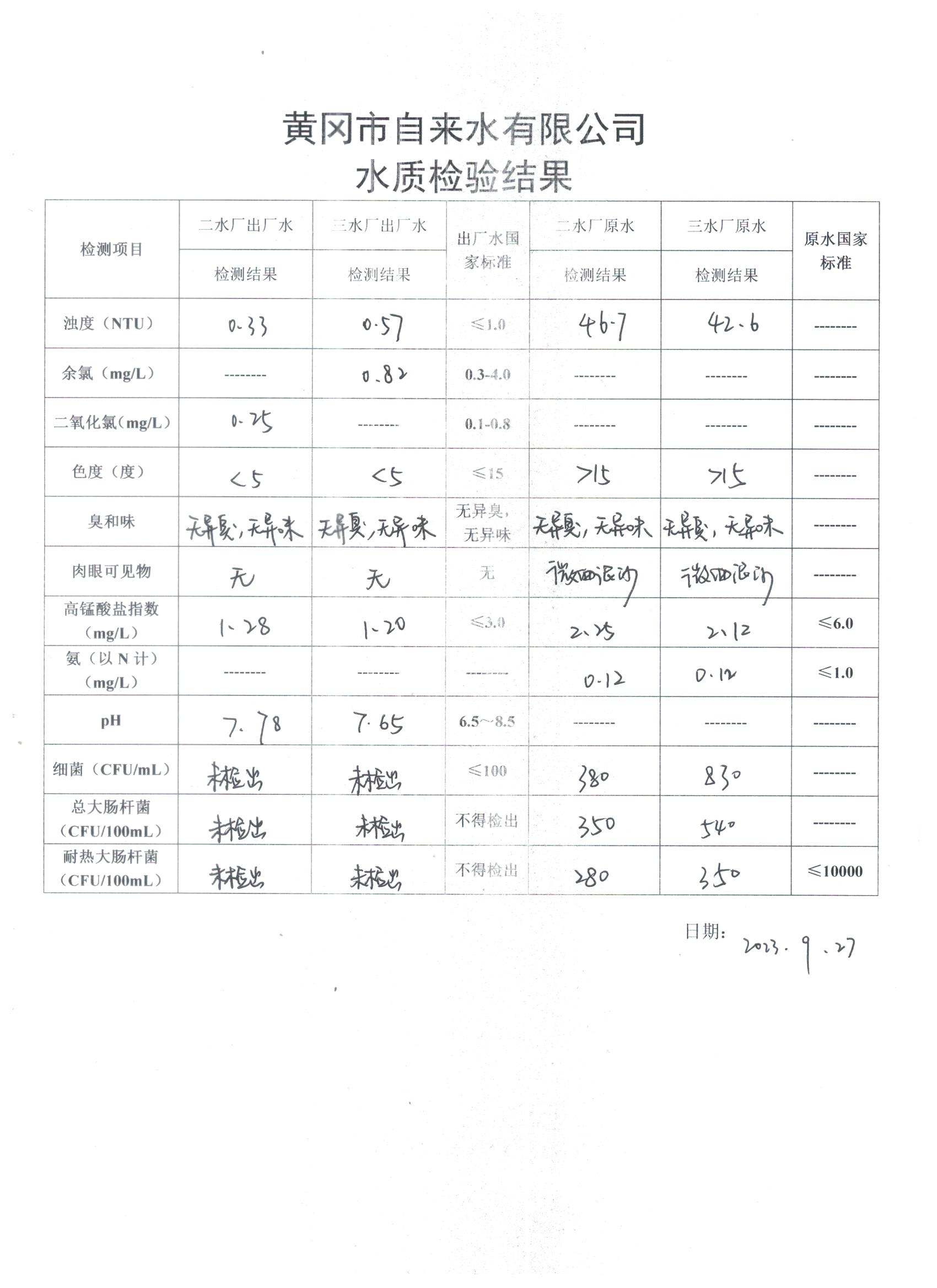 2023年9月27日水質(zhì)檢測日報(bào)表