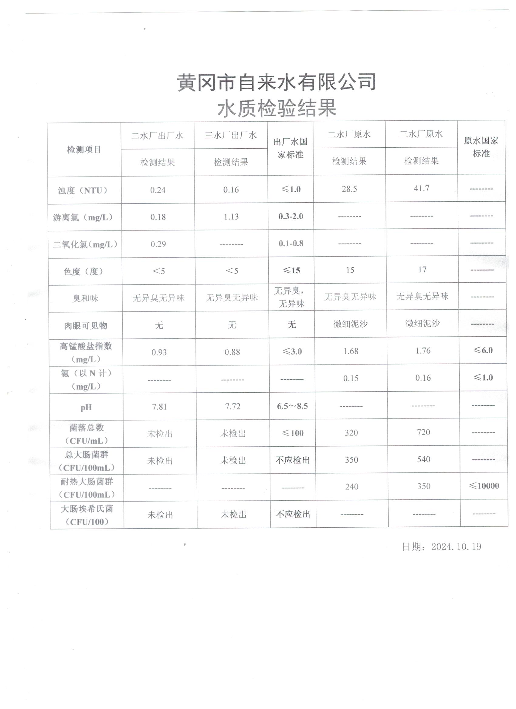 2024年10月19日水質(zhì)檢測日報表