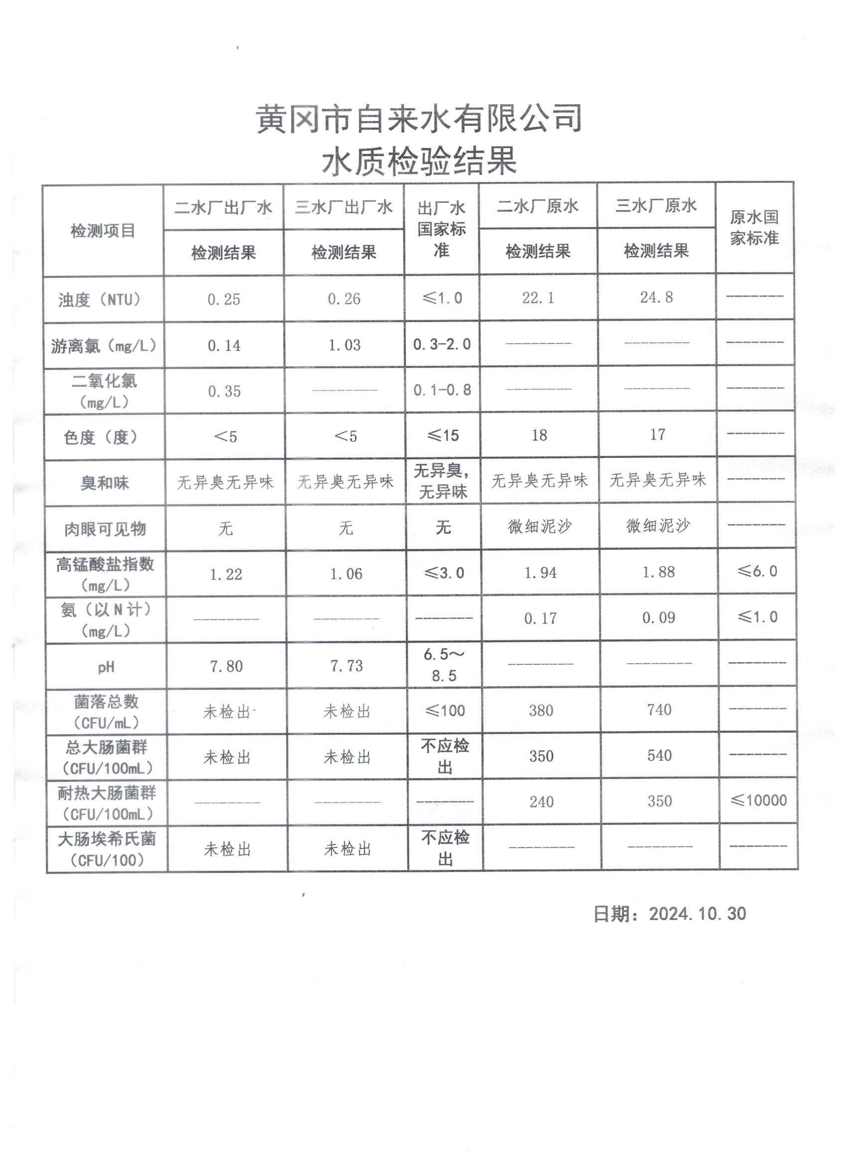 2024年10月30日水質(zhì)檢測(cè)日?qǐng)?bào)表