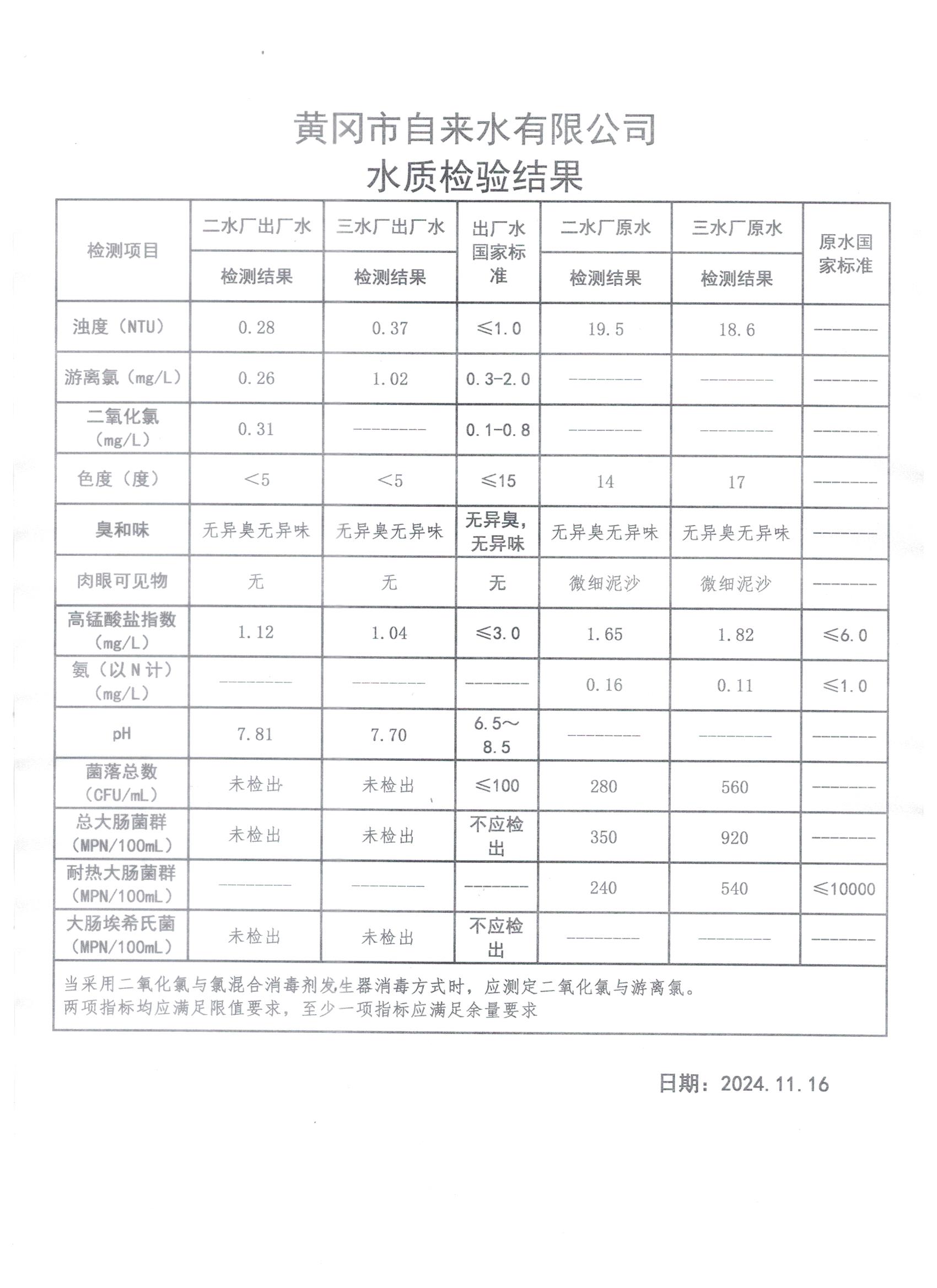 2024年11月16日水質(zhì)檢測日報表