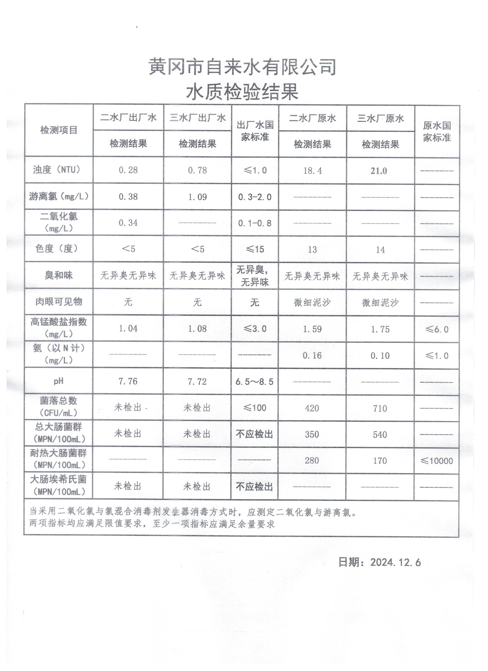 2024年12月6日水質(zhì)檢測(cè)日?qǐng)?bào)表