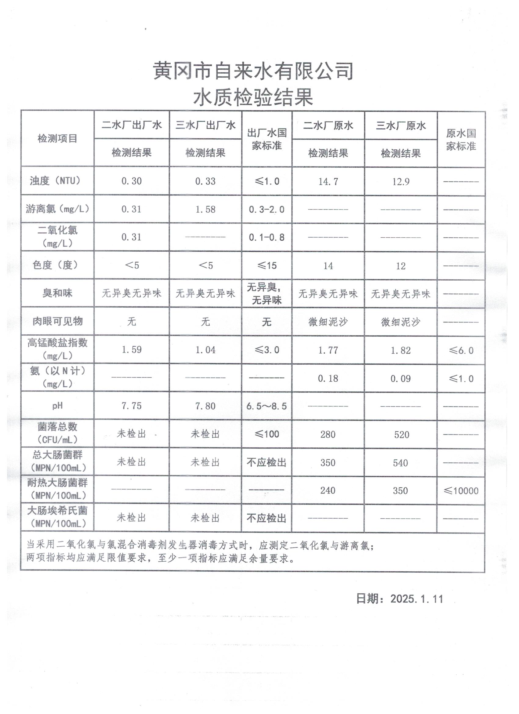 2025年1月11日水質(zhì)檢測(cè)日?qǐng)?bào)表
