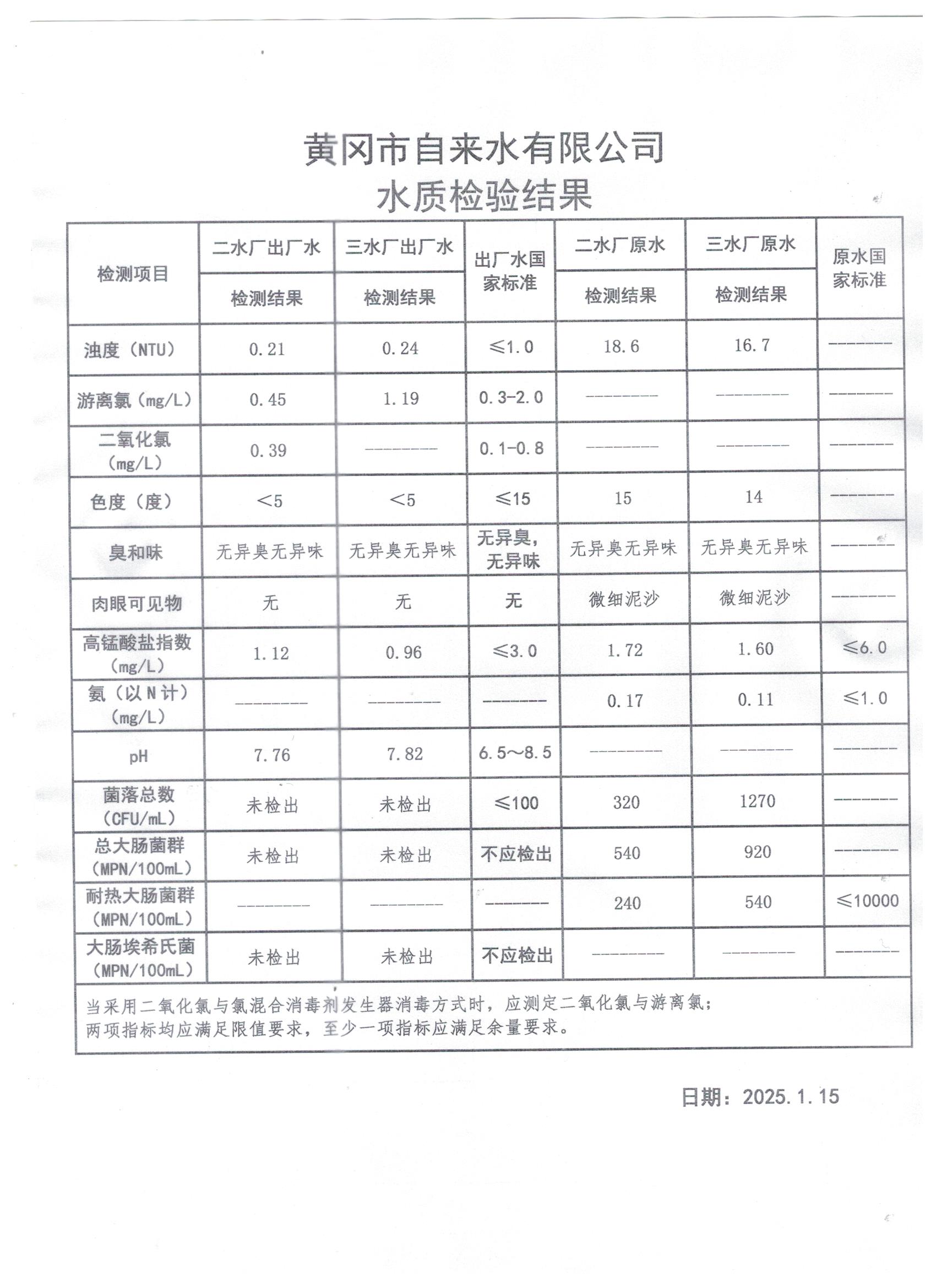 2025年1月15日水質(zhì)檢測(cè)日?qǐng)?bào)表