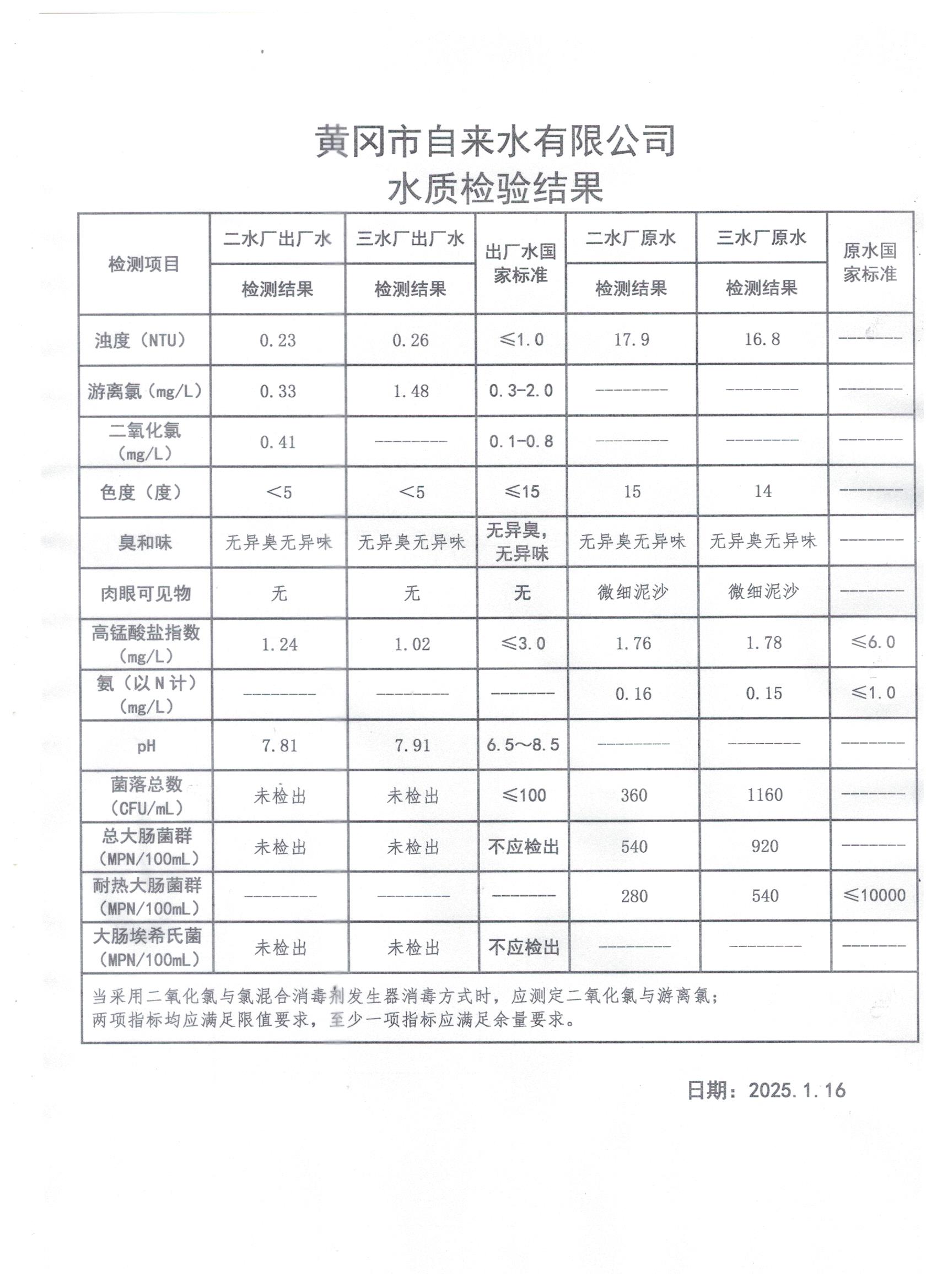 2025年1月16日水質(zhì)檢測日報(bào)表