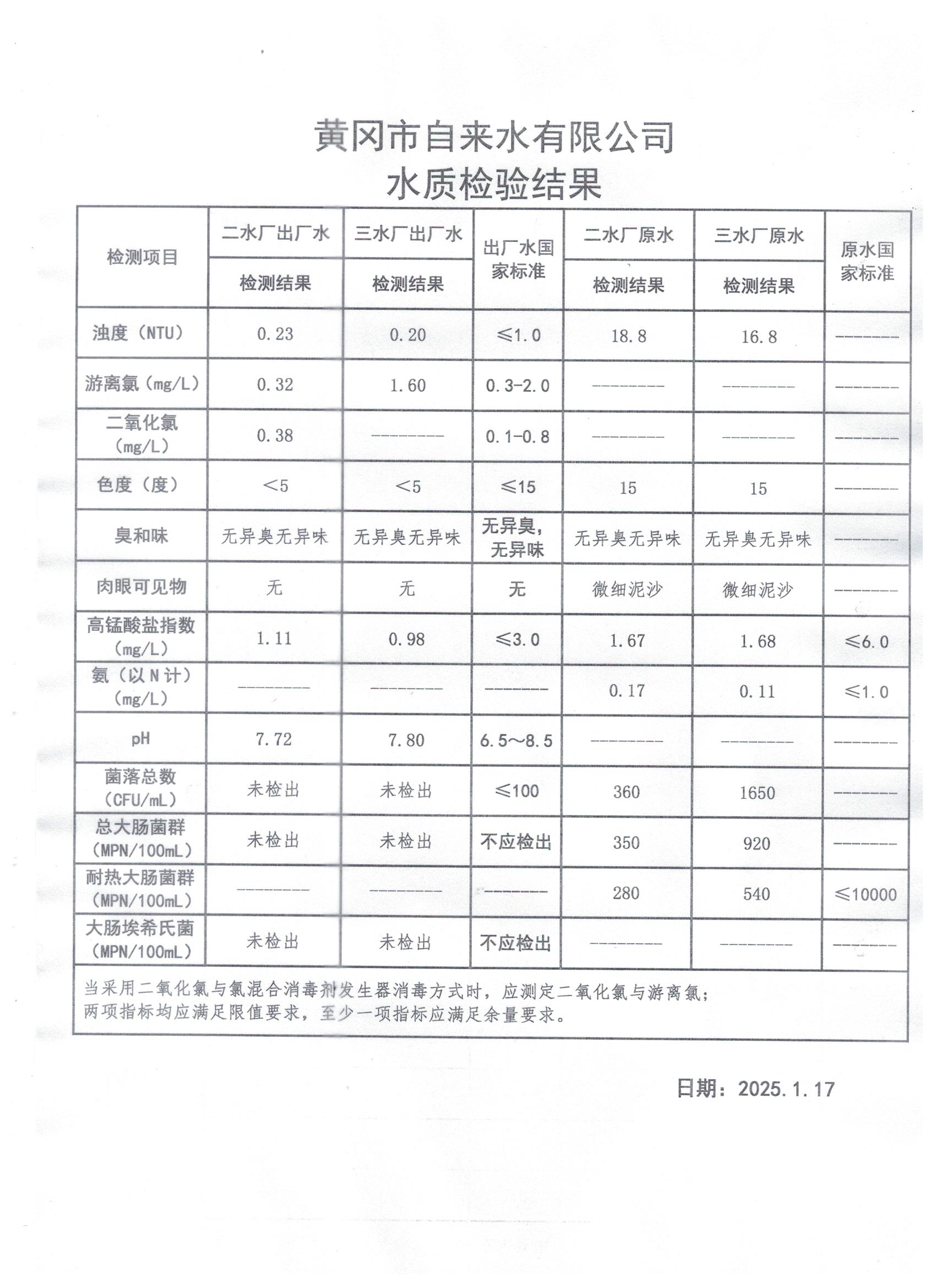 2025年1月17日水質(zhì)檢測(cè)日?qǐng)?bào)表