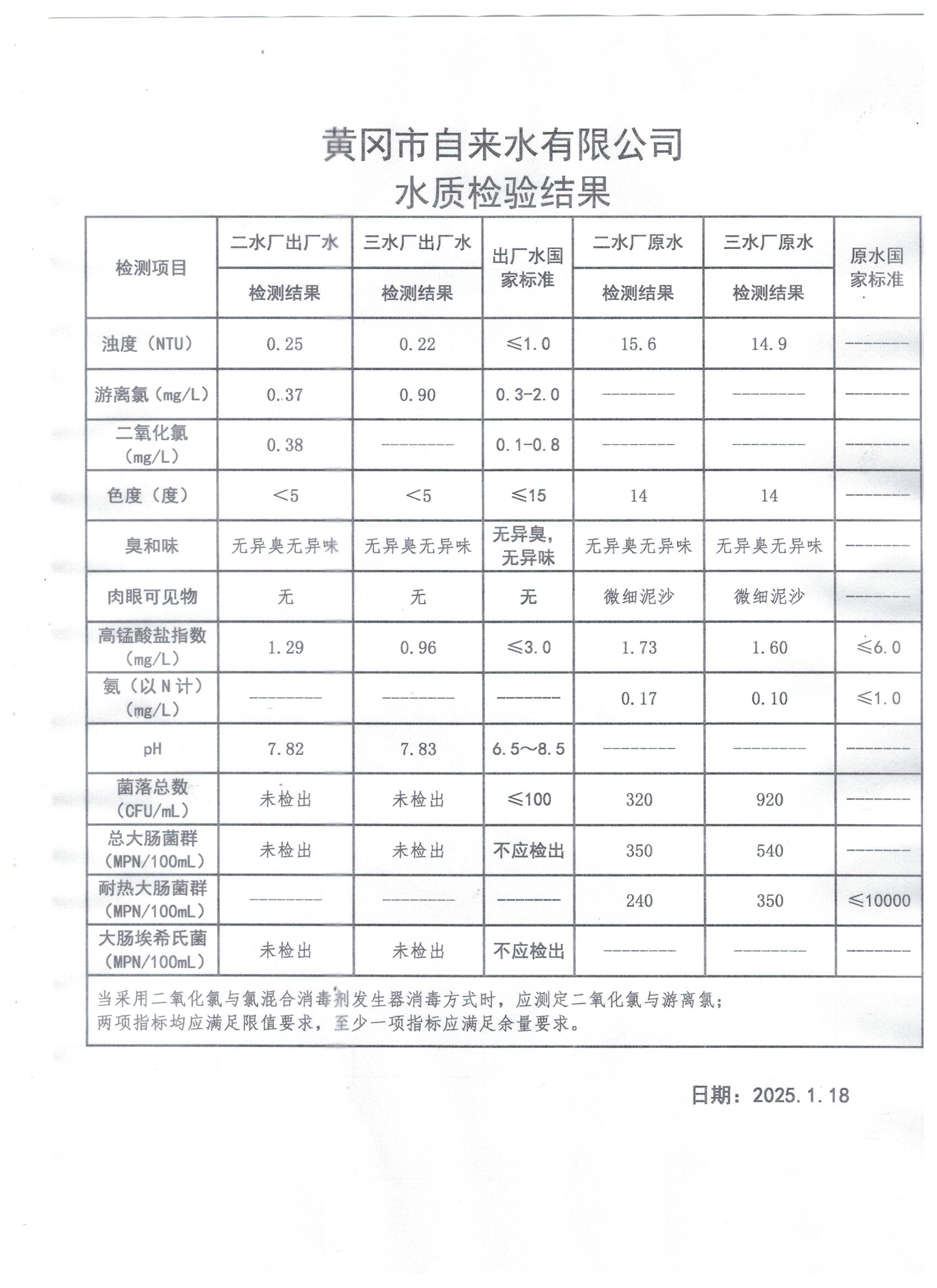 2025年1月18日水質(zhì)檢測(cè)日?qǐng)?bào)表