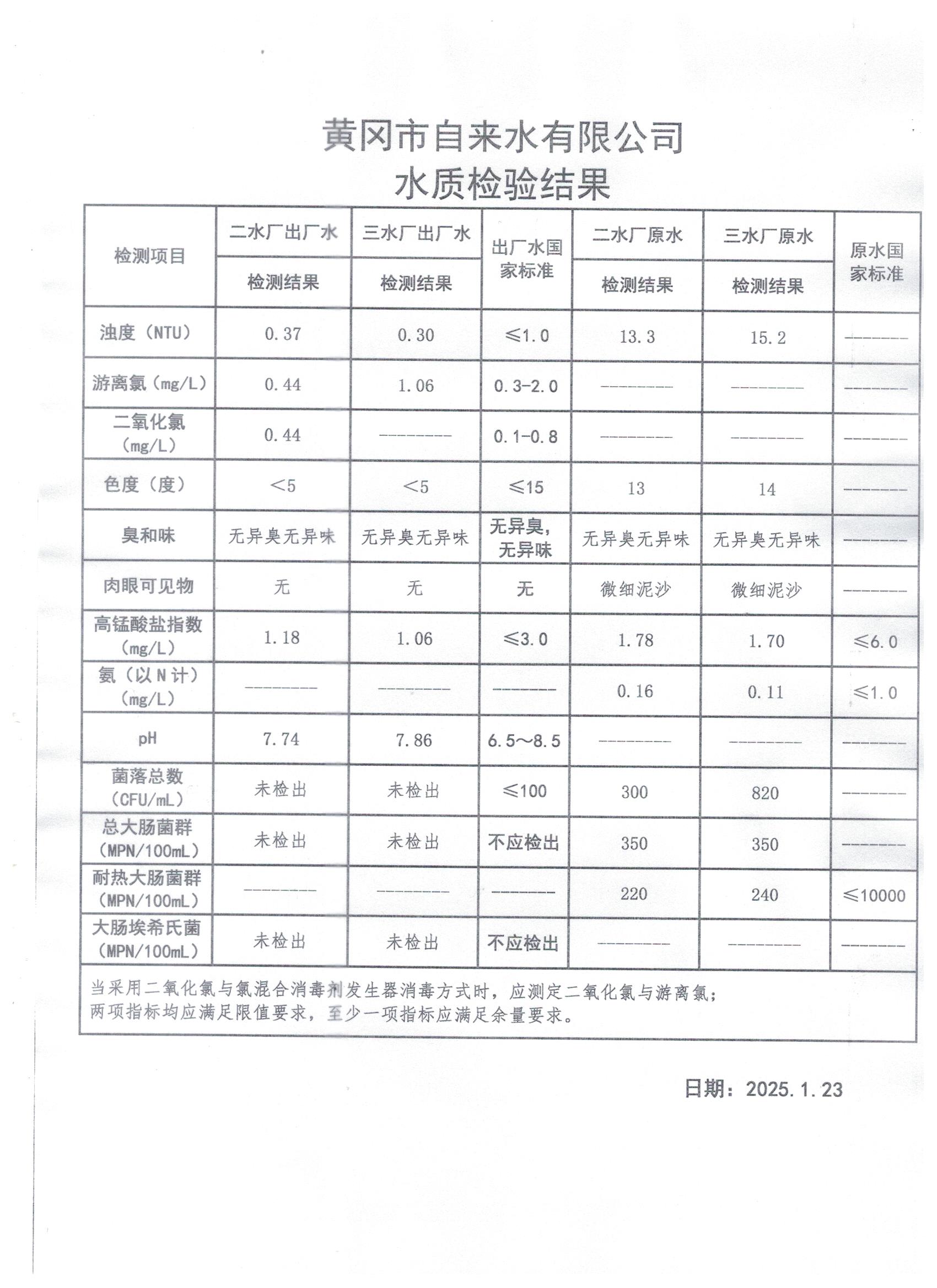2025年1月23日水質(zhì)檢測日報表