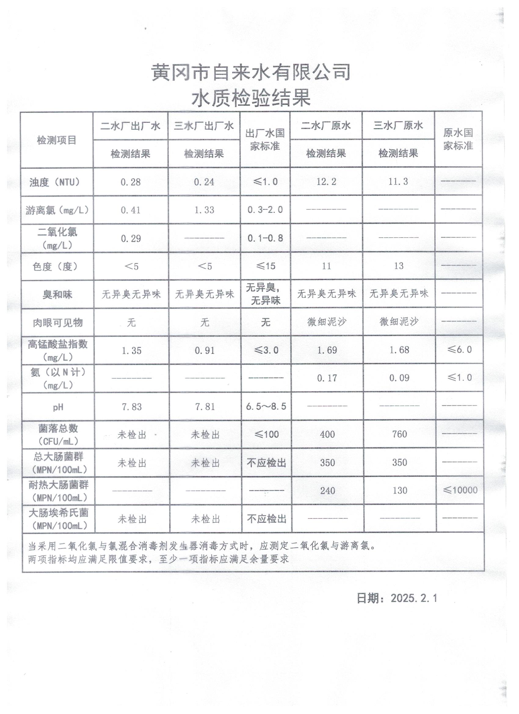 2025年2月1日水質(zhì)檢測日報表