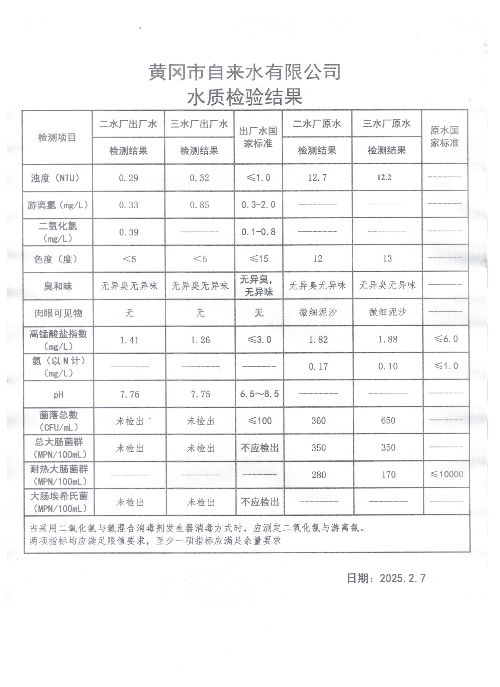2025年2月7日水質(zhì)檢測日報表