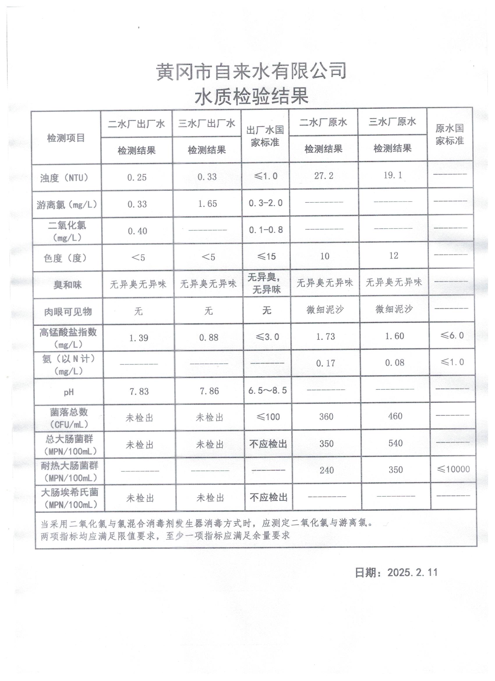 2025年2月11日水質(zhì)檢測(cè)日?qǐng)?bào)表