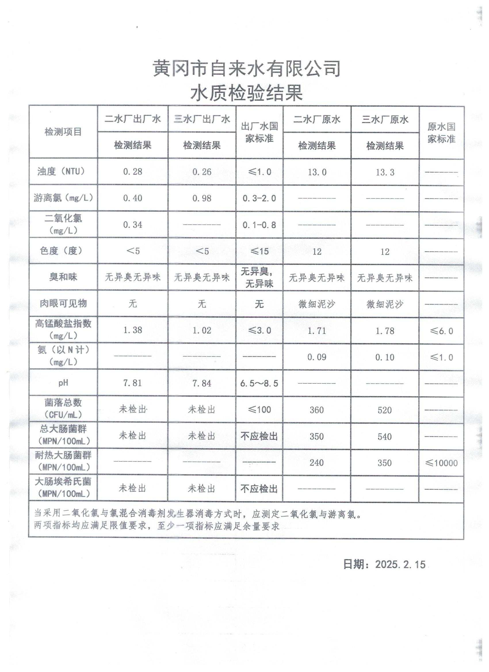 2025年2月15日水質(zhì)檢測日報表