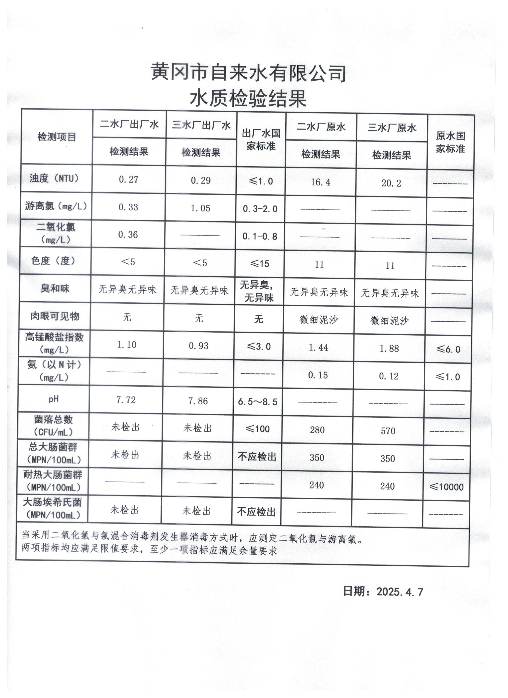 2025年4月7日水質(zhì)檢測(cè)日?qǐng)?bào)表