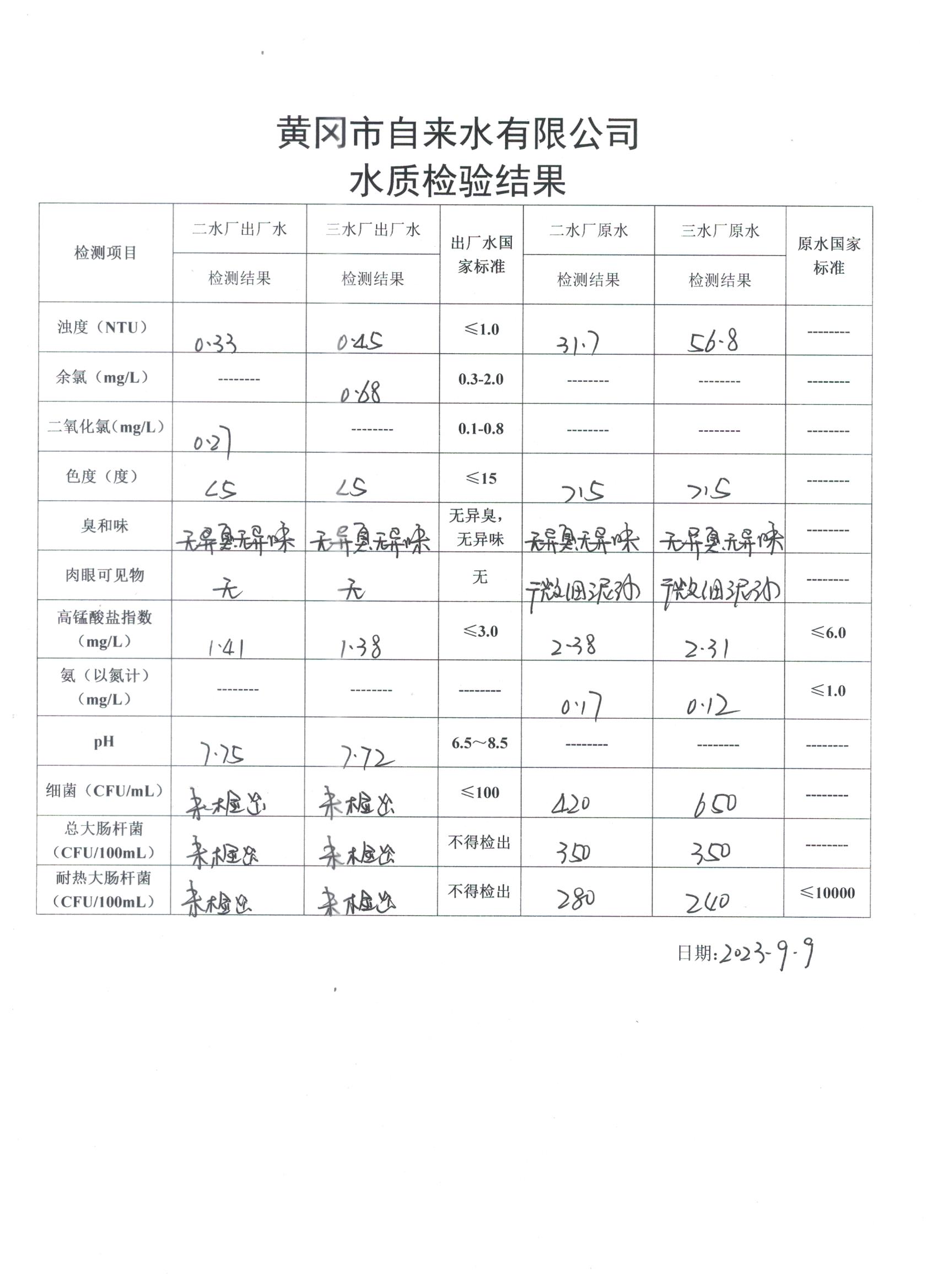 2023年9月9日水質(zhì)檢驗(yàn)日?qǐng)?bào)表