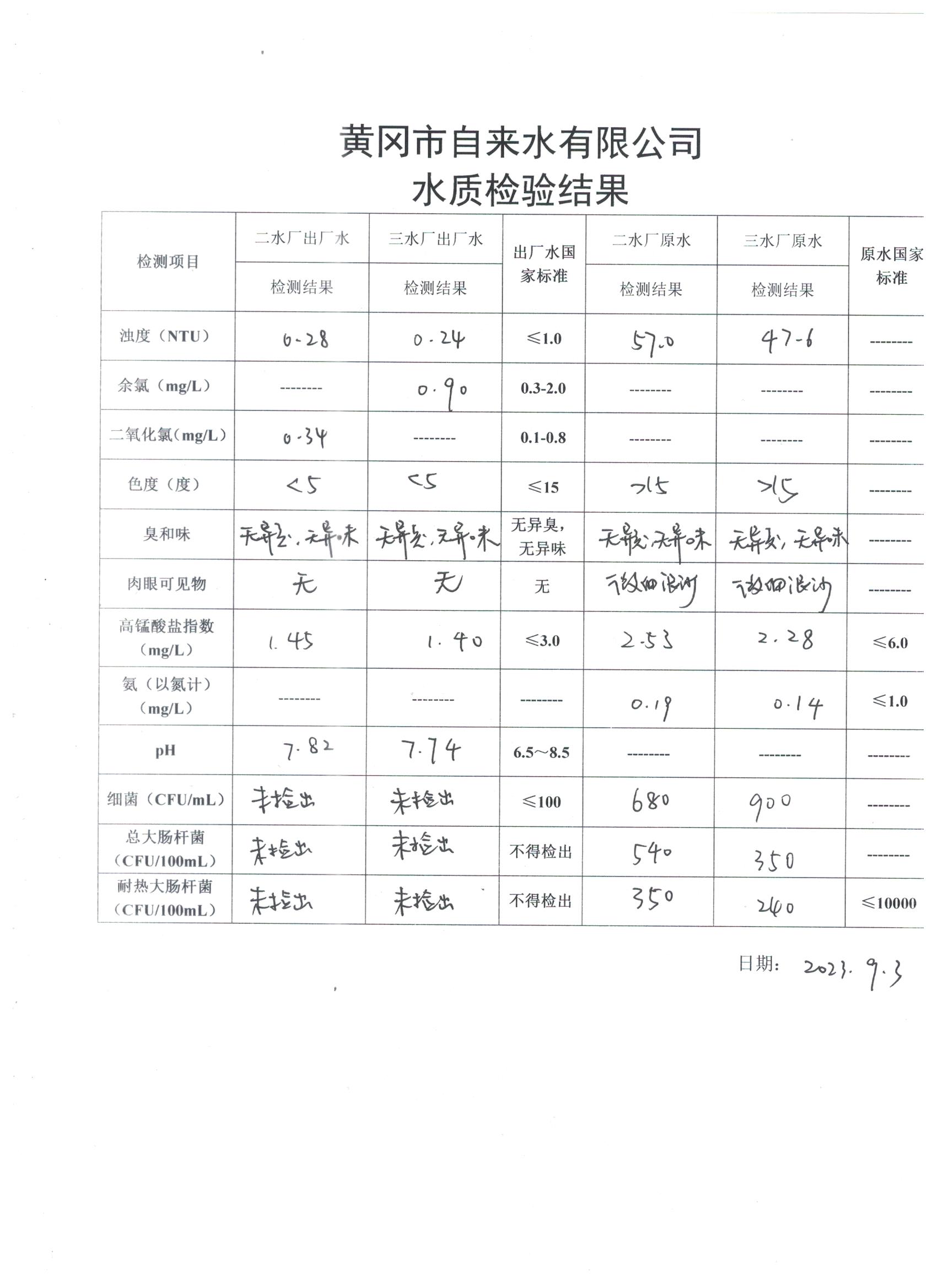 2023年9月3日水質(zhì)檢驗日報表