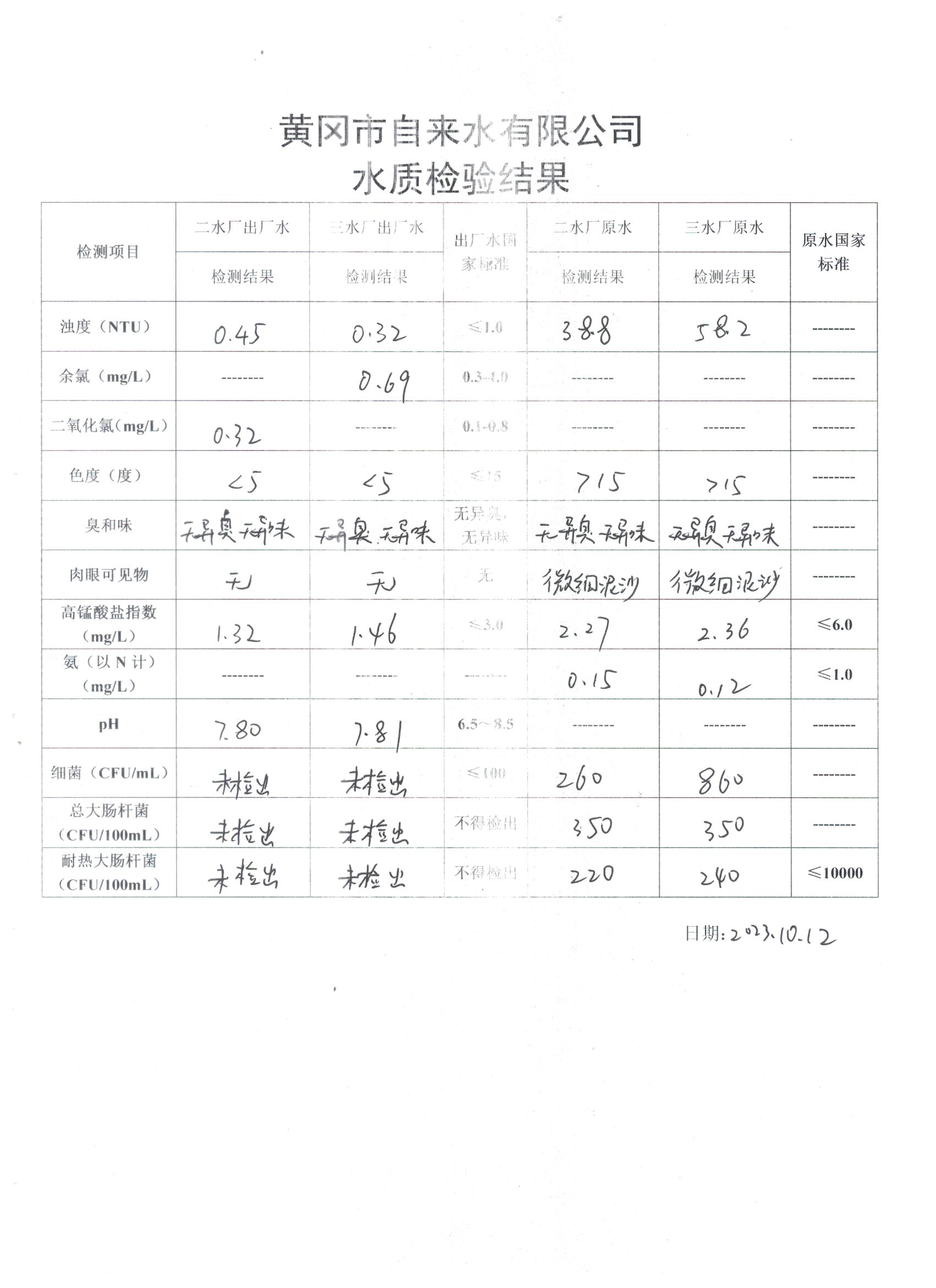 2023年10月12日水質(zhì)檢驗(yàn)日?qǐng)?bào)表