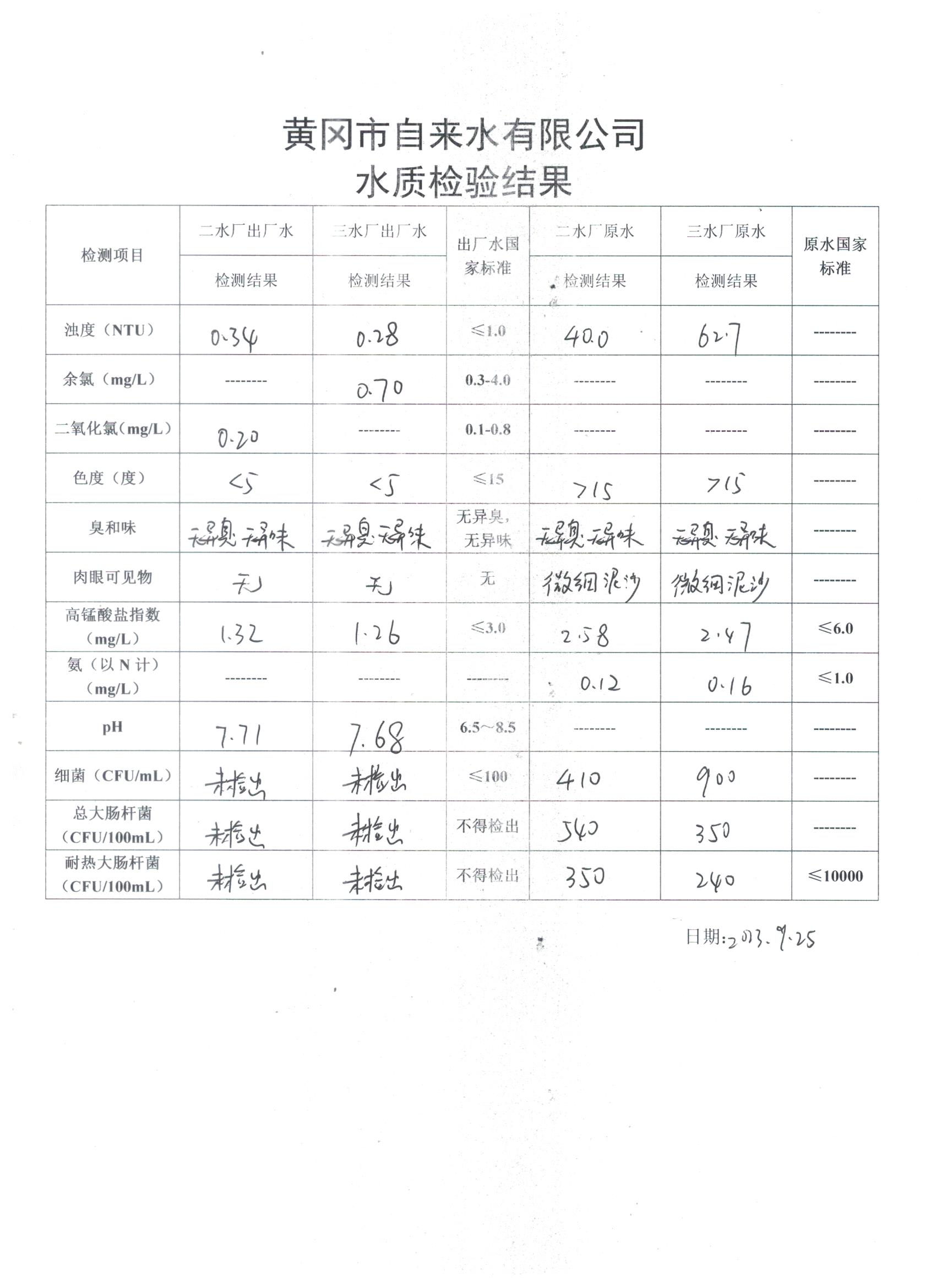 2023年9月25日水質(zhì)檢驗日報表