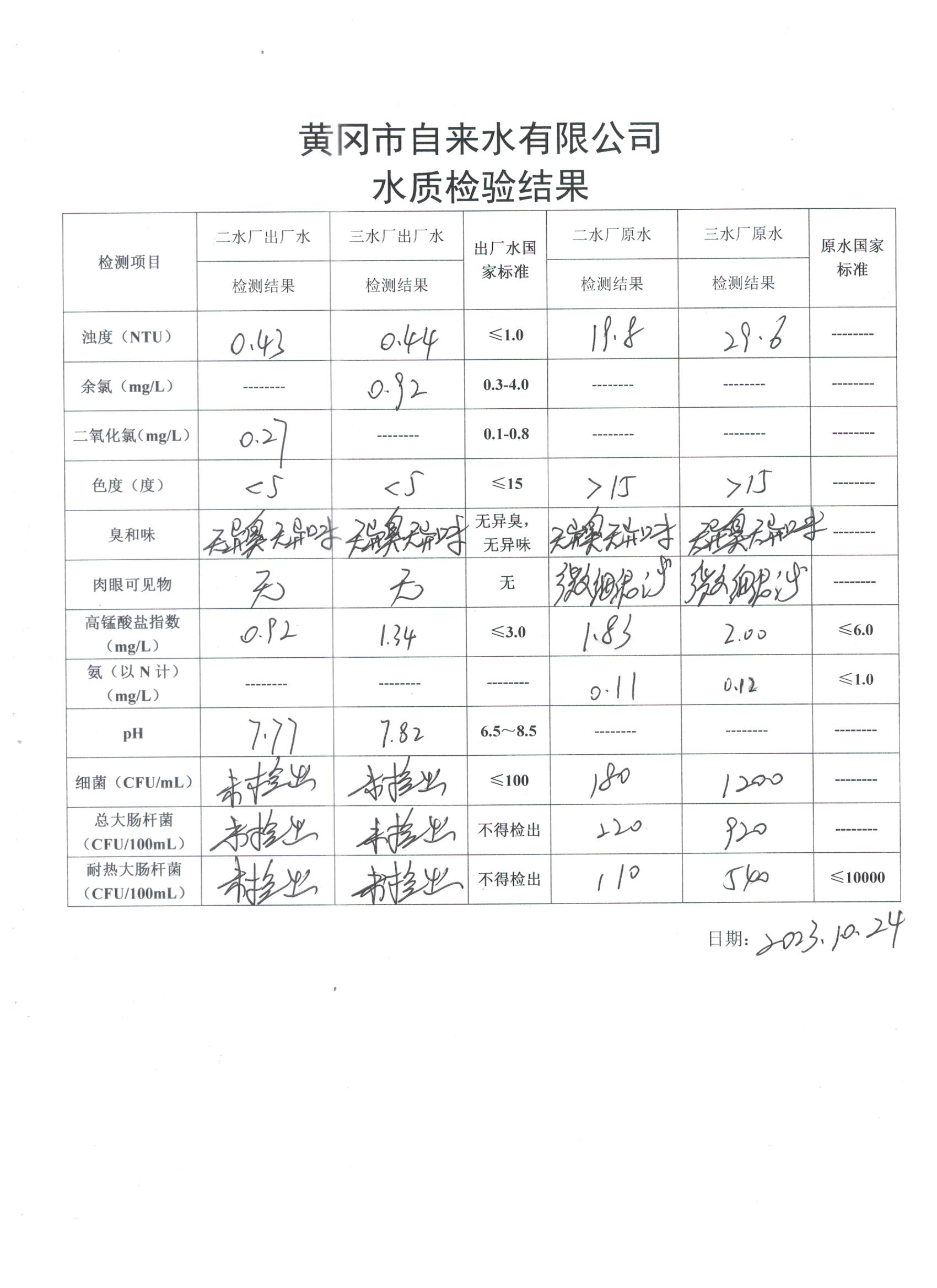 2023年10月24日水質(zhì)檢驗(yàn)日報表