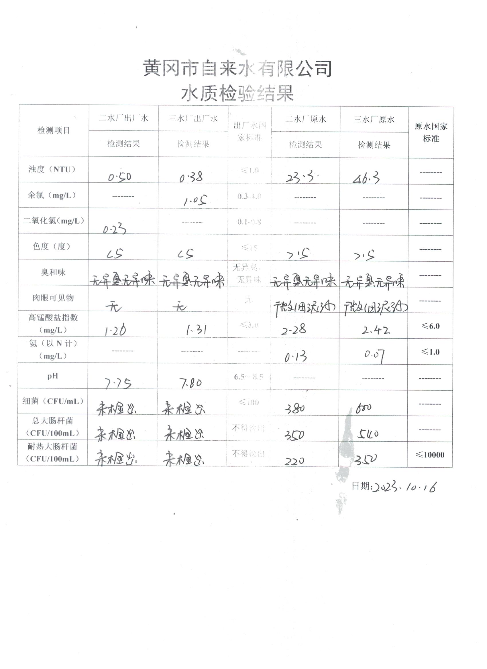 2023年10月16日水質(zhì)檢驗(yàn)日報(bào)表