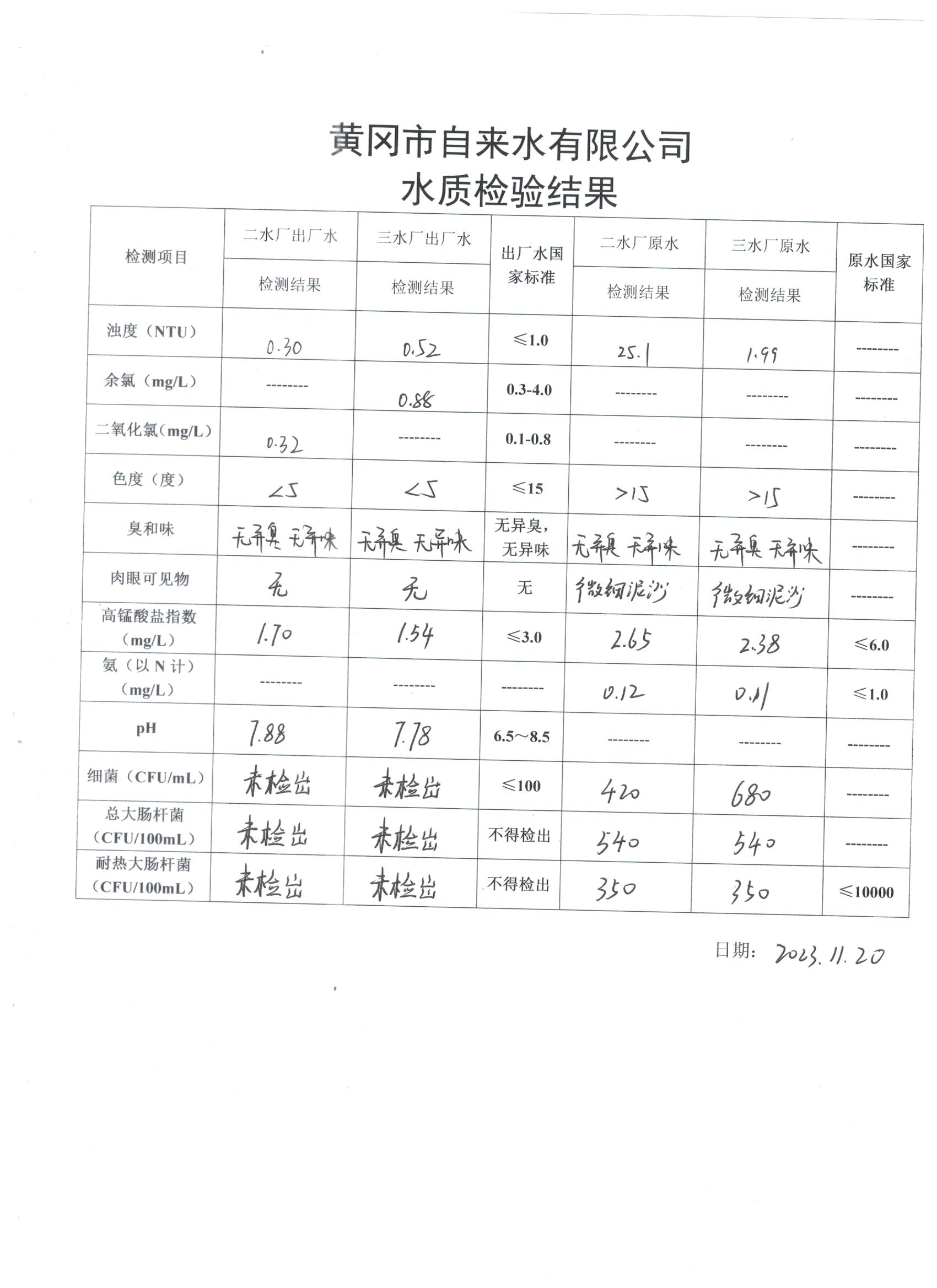 2023年11月20日水質(zhì)檢驗日報表
