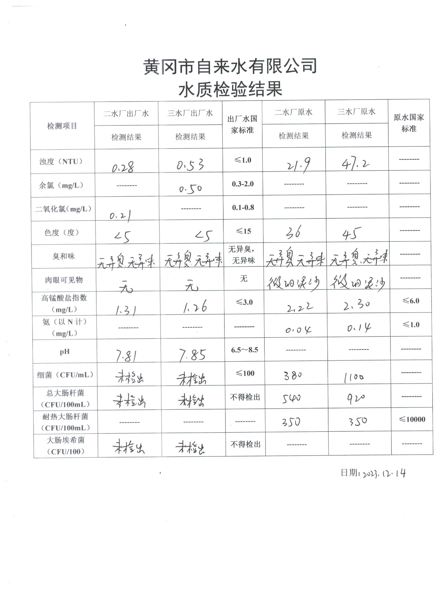 2023年12月14日水質(zhì)檢驗日報表