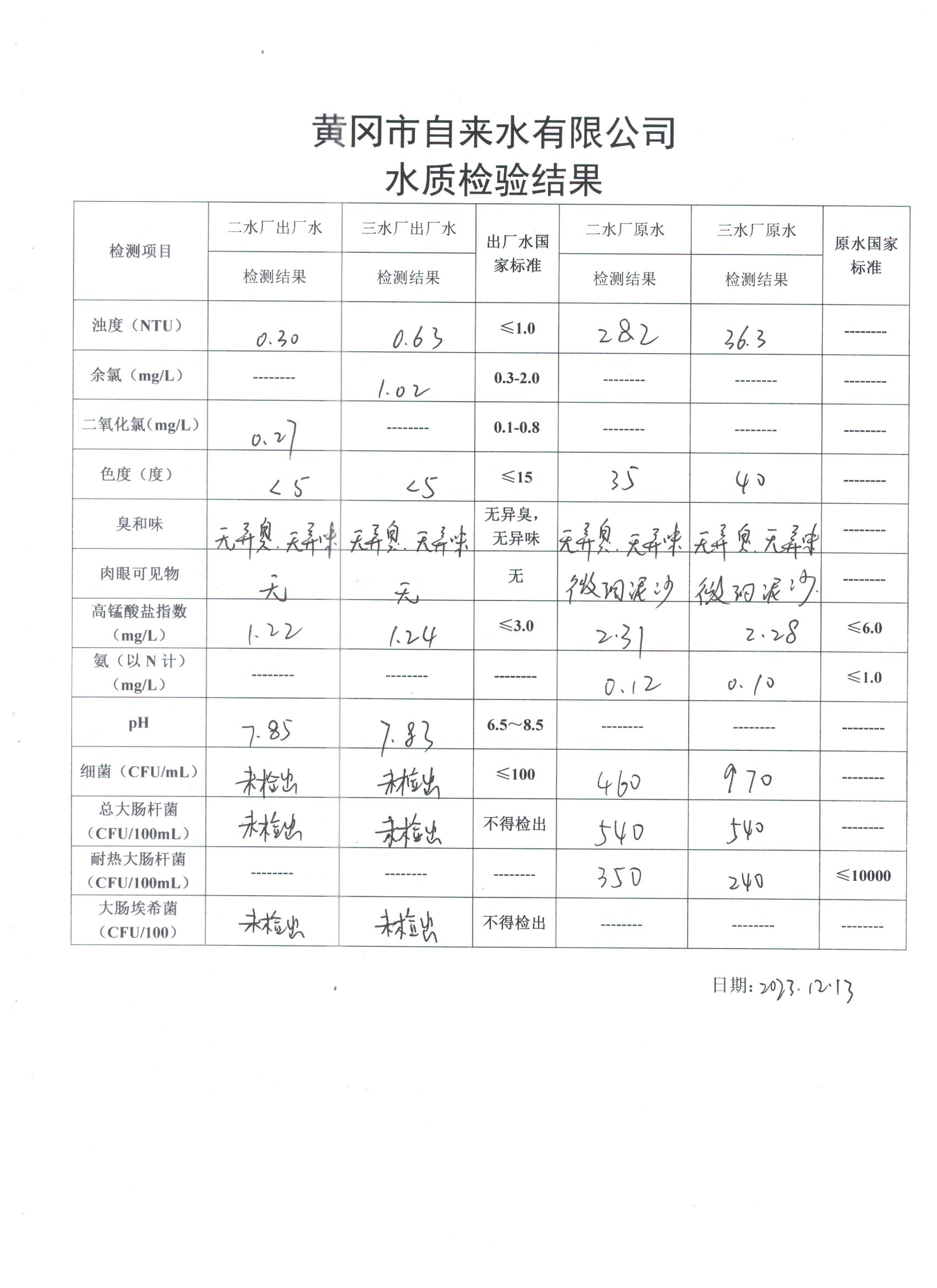 2023年12月13日水質(zhì)檢驗(yàn)日?qǐng)?bào)表