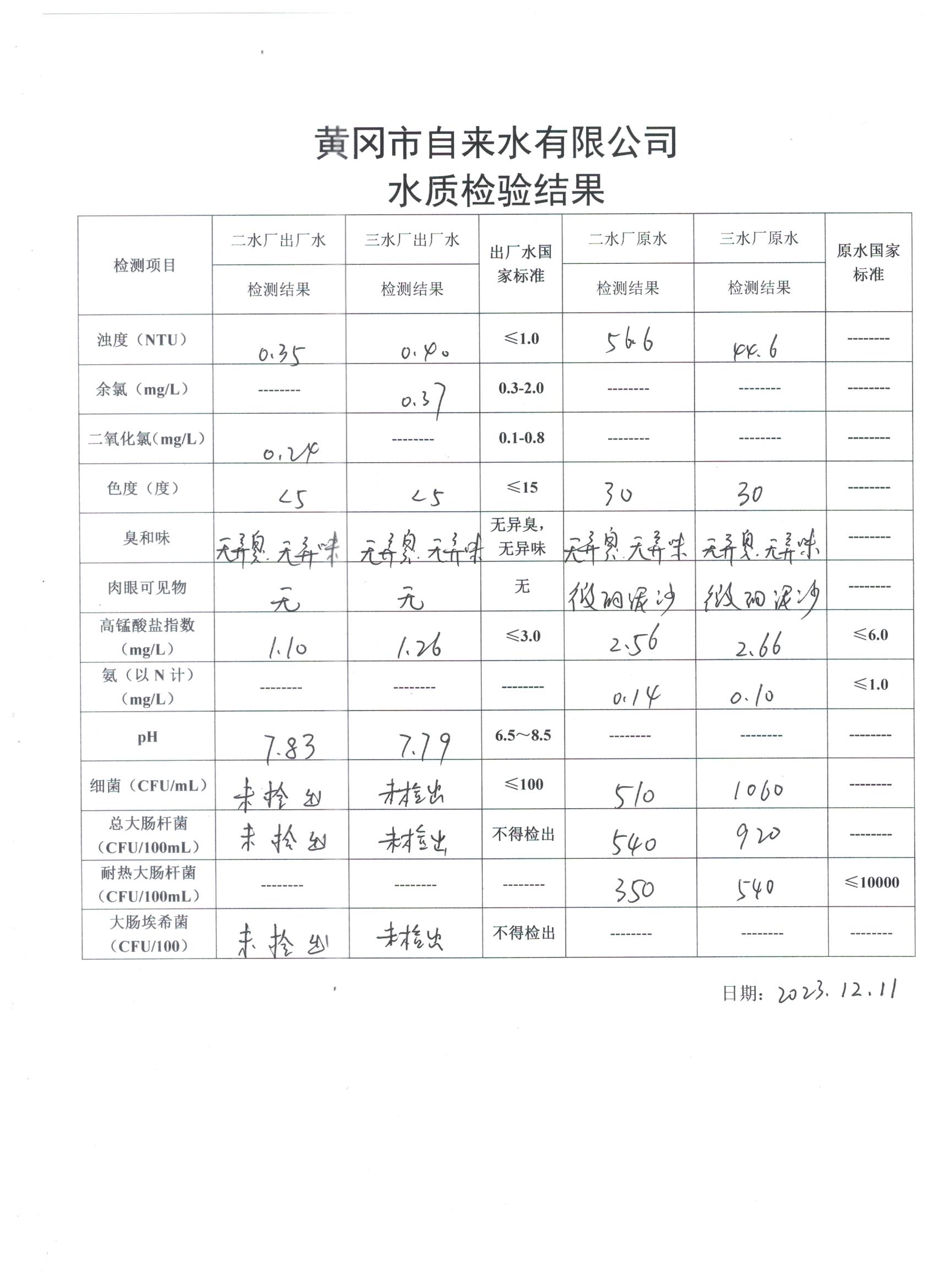2023年12月11日水質(zhì)檢驗(yàn)日?qǐng)?bào)表