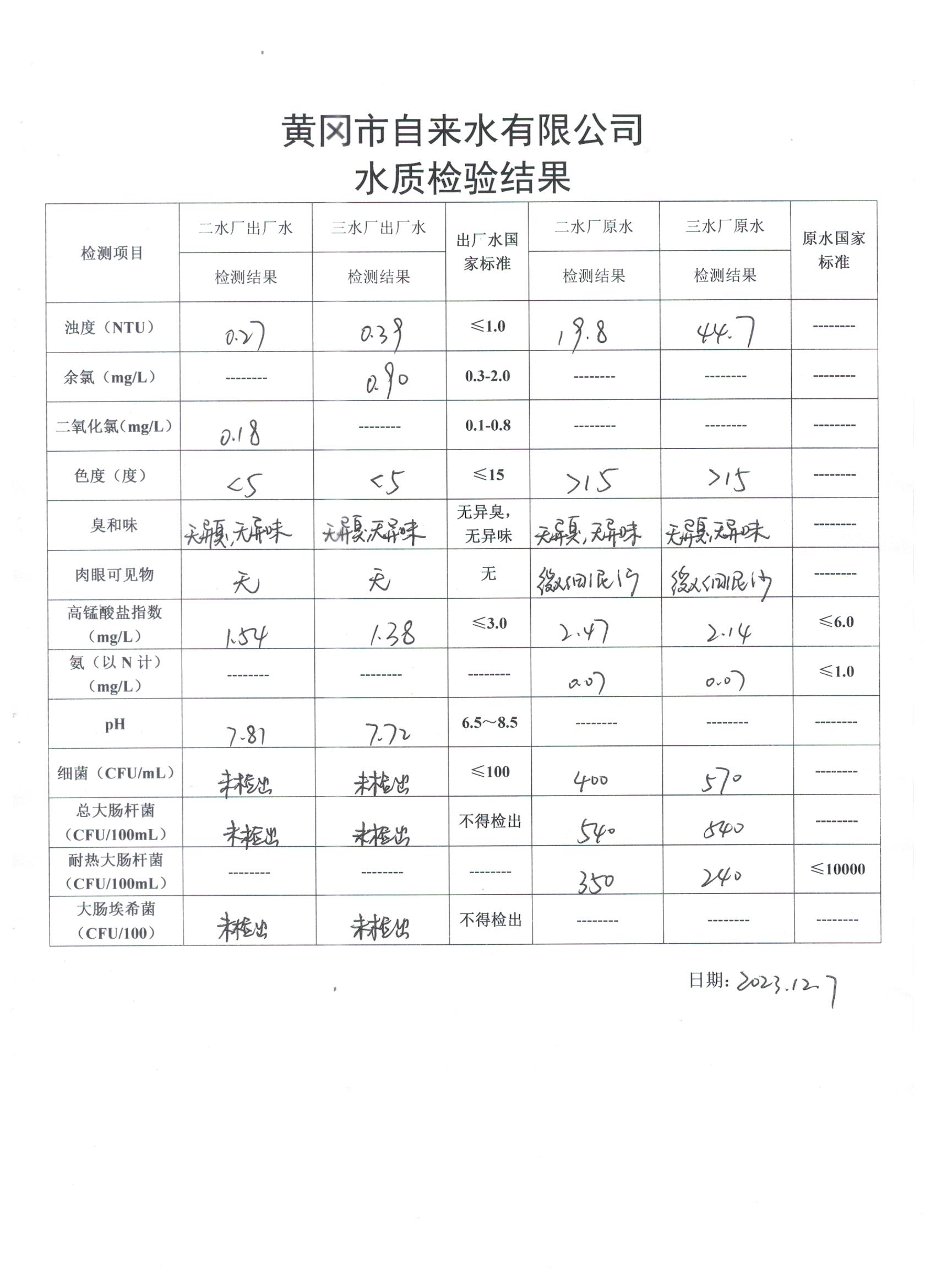 2023年12月7日水質(zhì)檢驗(yàn)日?qǐng)?bào)表
