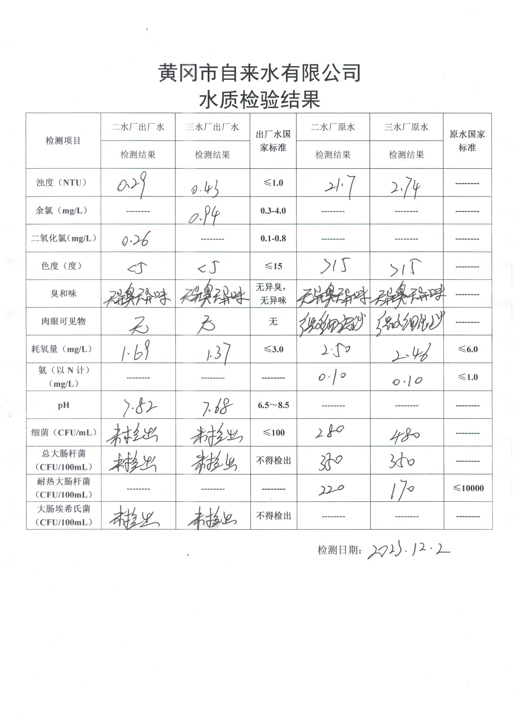 2023年12月2日水質(zhì)檢驗(yàn)日?qǐng)?bào)表
