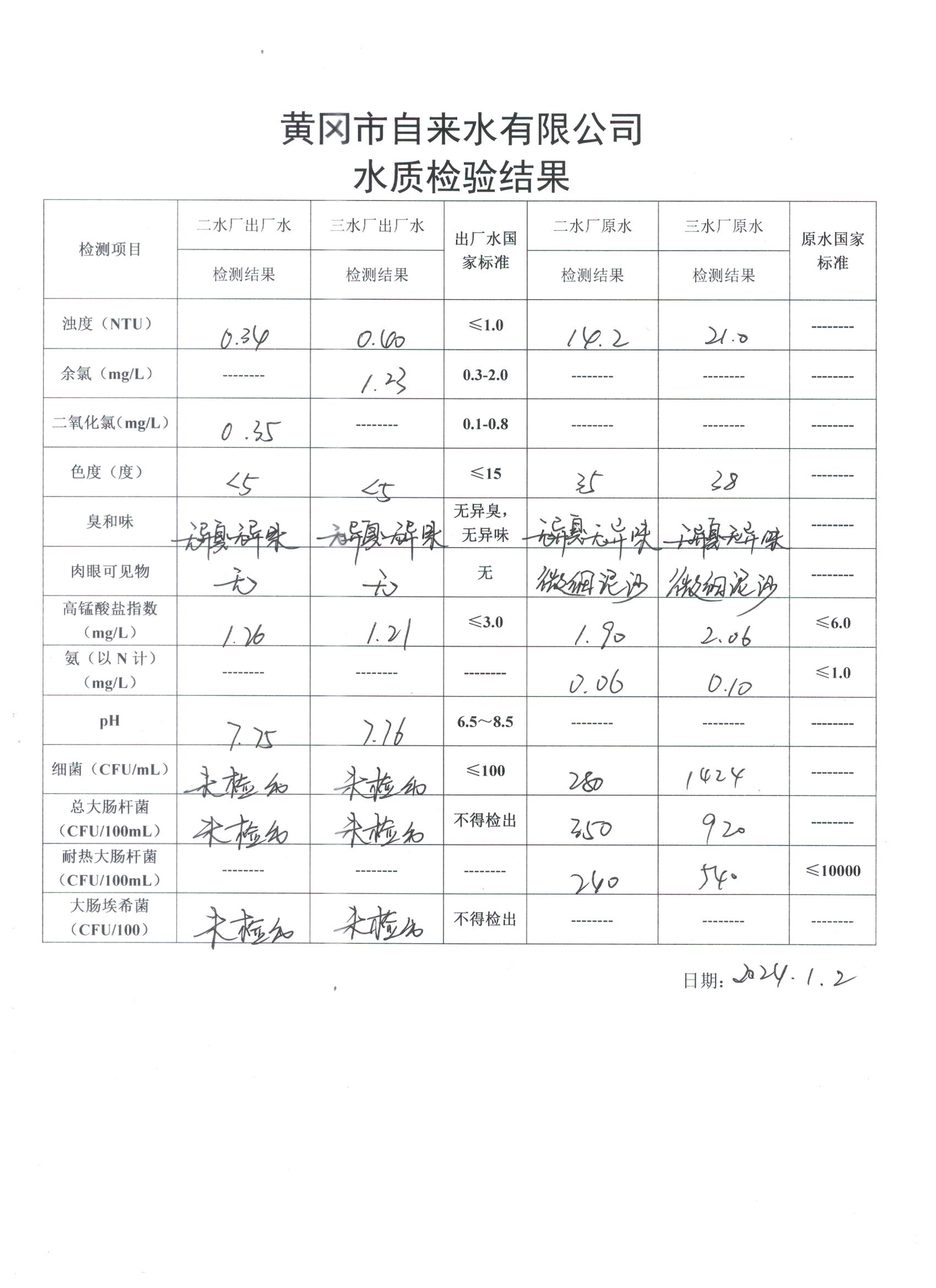 2024年1月2日水質(zhì)檢驗(yàn)日?qǐng)?bào)表