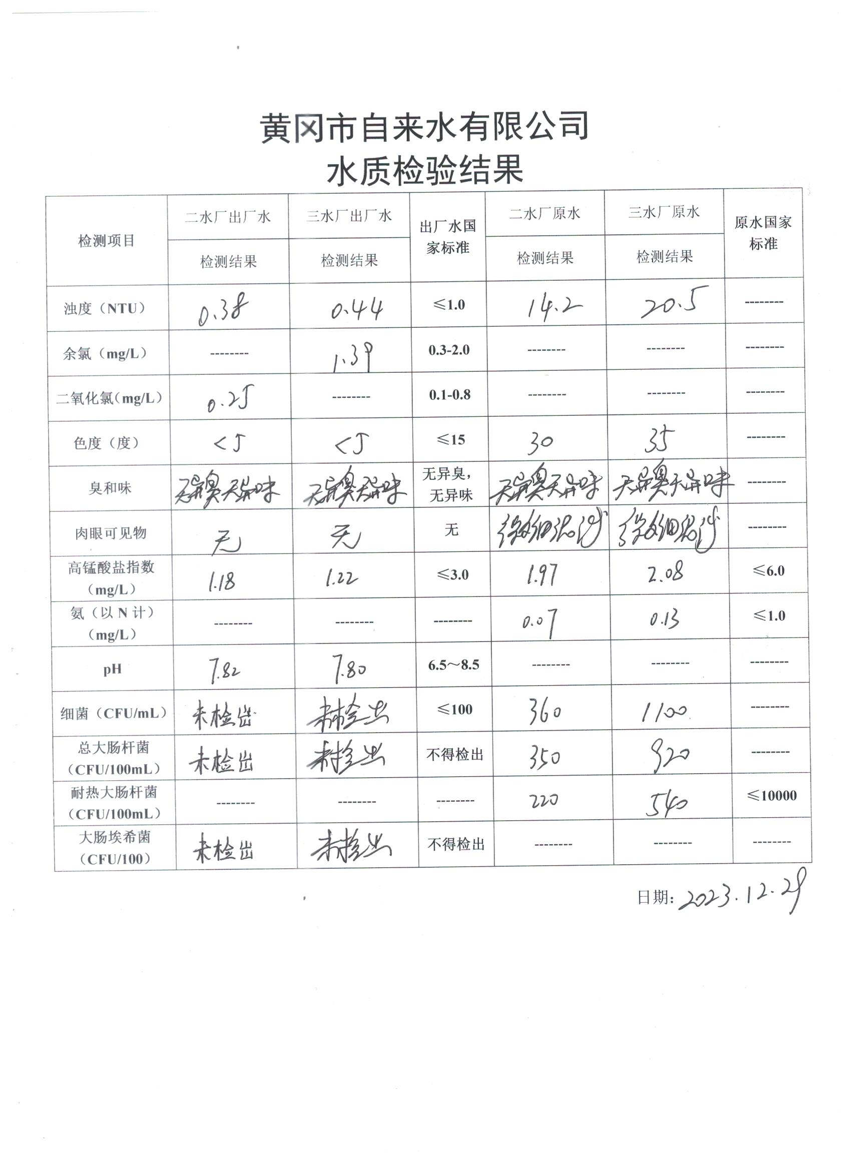 2023年12月29日水質(zhì)檢驗(yàn)日?qǐng)?bào)表