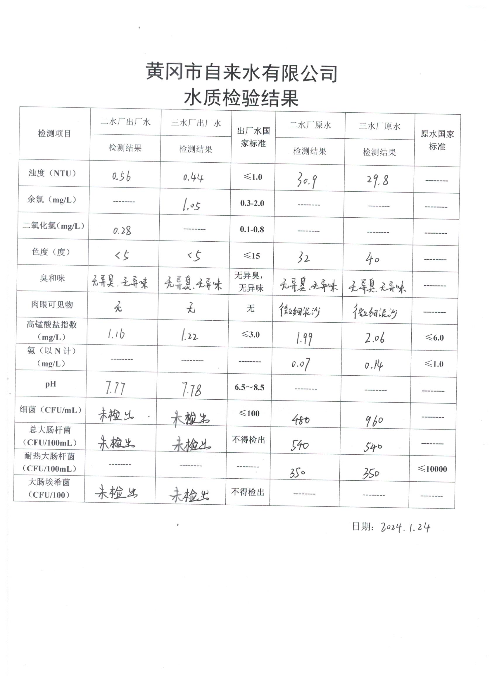 2024年1月24日水質(zhì)檢驗(yàn)日?qǐng)?bào)表