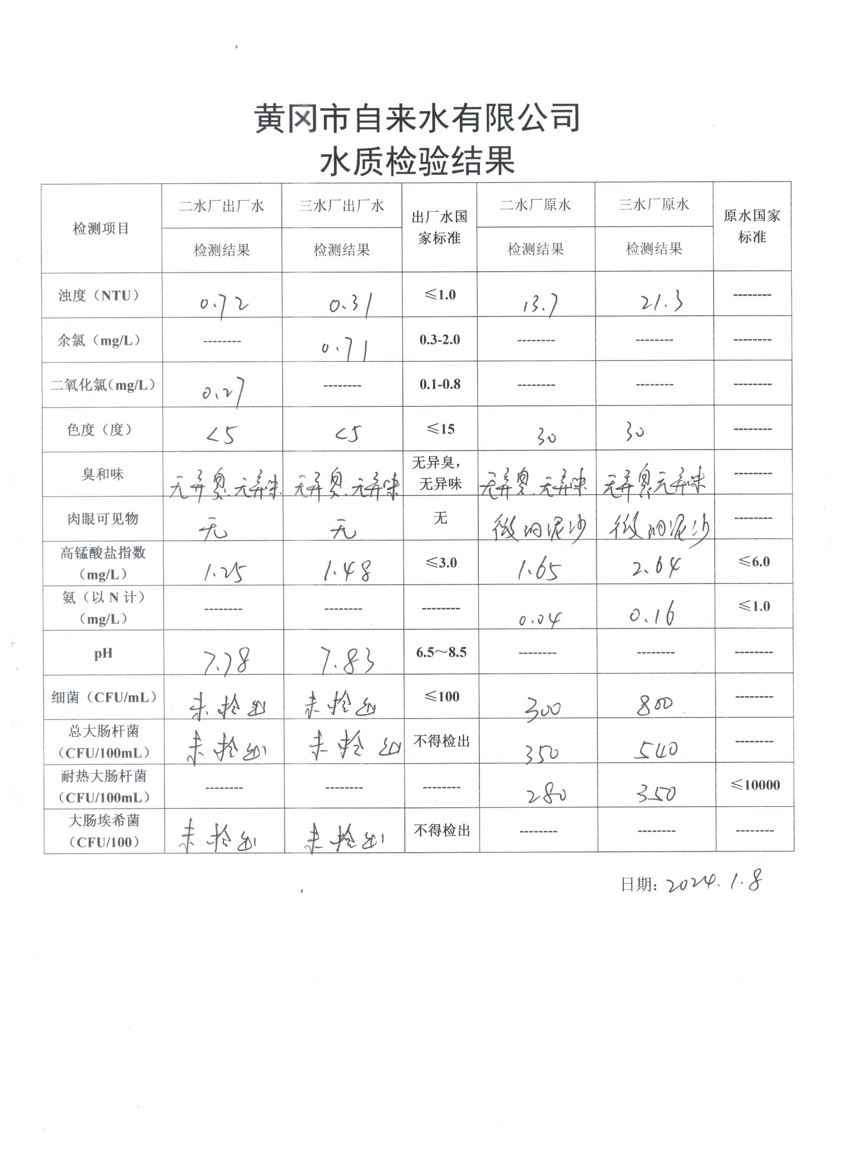 2024年1月8日水質(zhì)檢驗(yàn)日報(bào)表