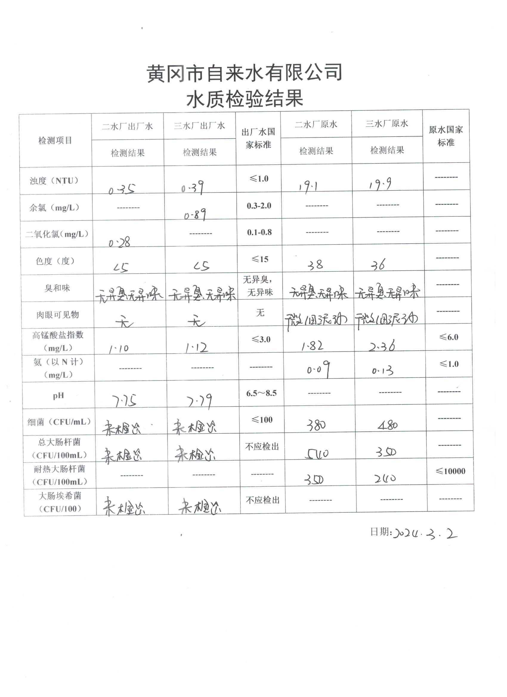 2024年3月2日水質(zhì)檢驗(yàn)日?qǐng)?bào)表