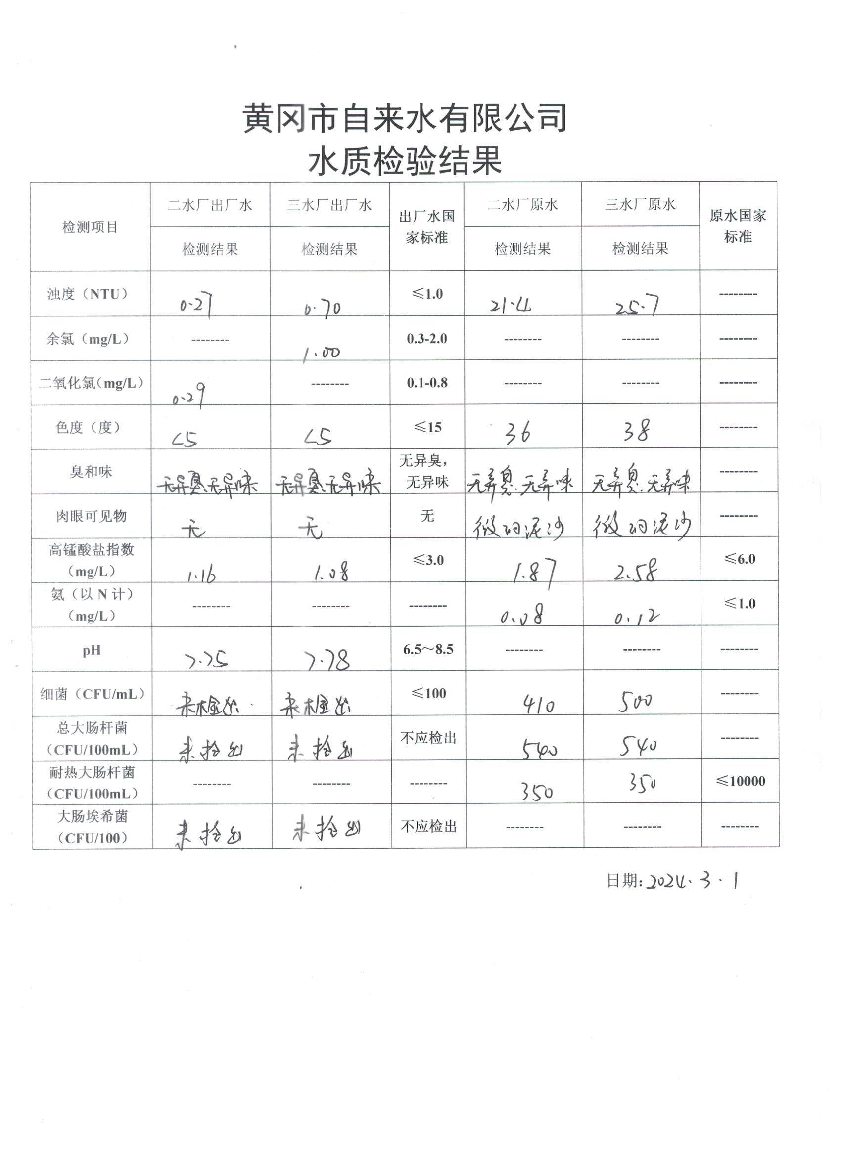 2024年3月1日水質(zhì)檢驗(yàn)日?qǐng)?bào)表