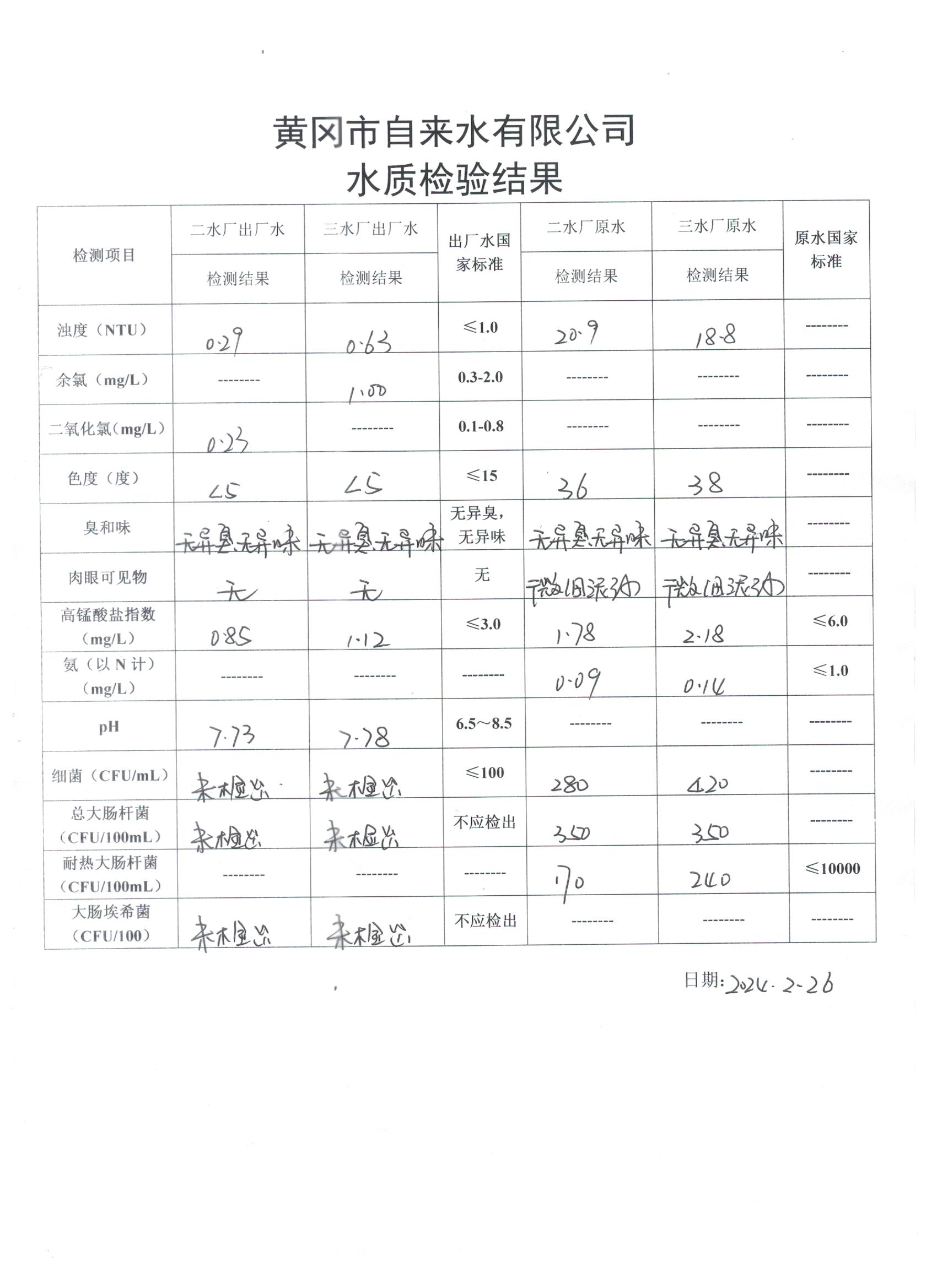 2024年2月26日水質(zhì)檢驗(yàn)日報(bào)表