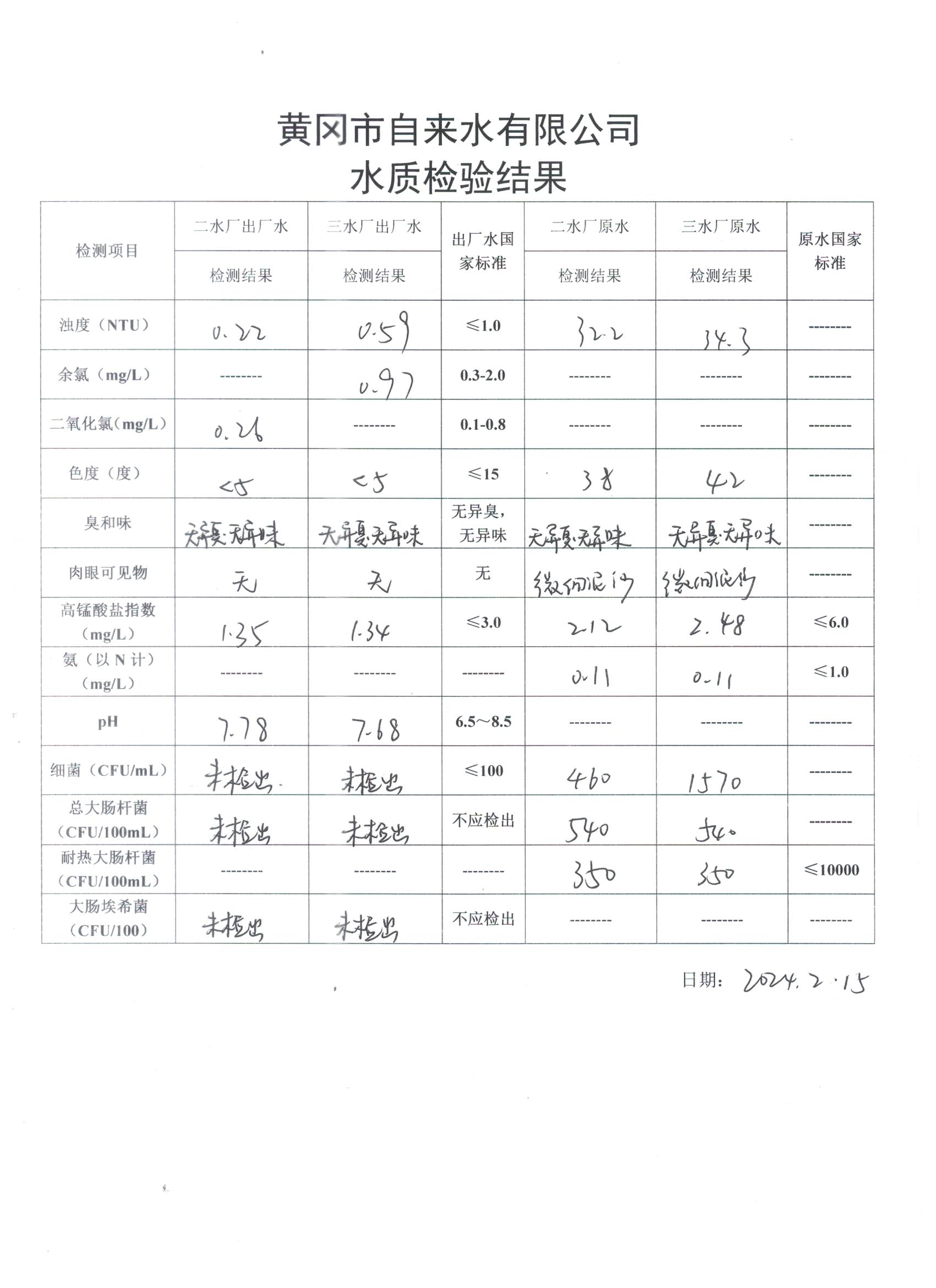2024年2月15日水質(zhì)檢驗(yàn)日?qǐng)?bào)表