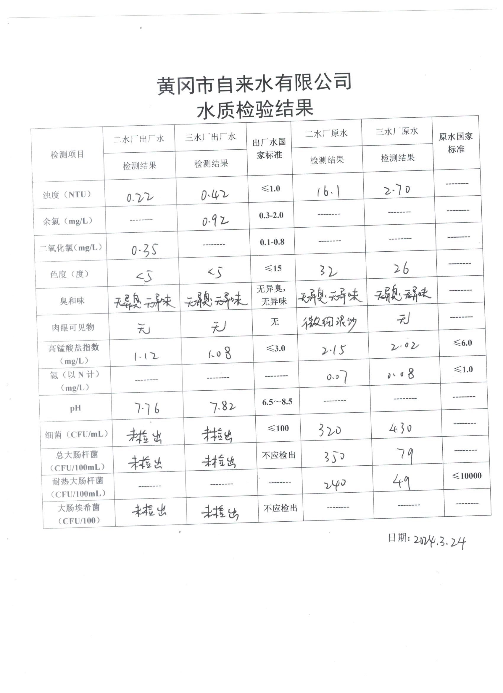 2024年3月24日水質(zhì)檢驗(yàn)日報表