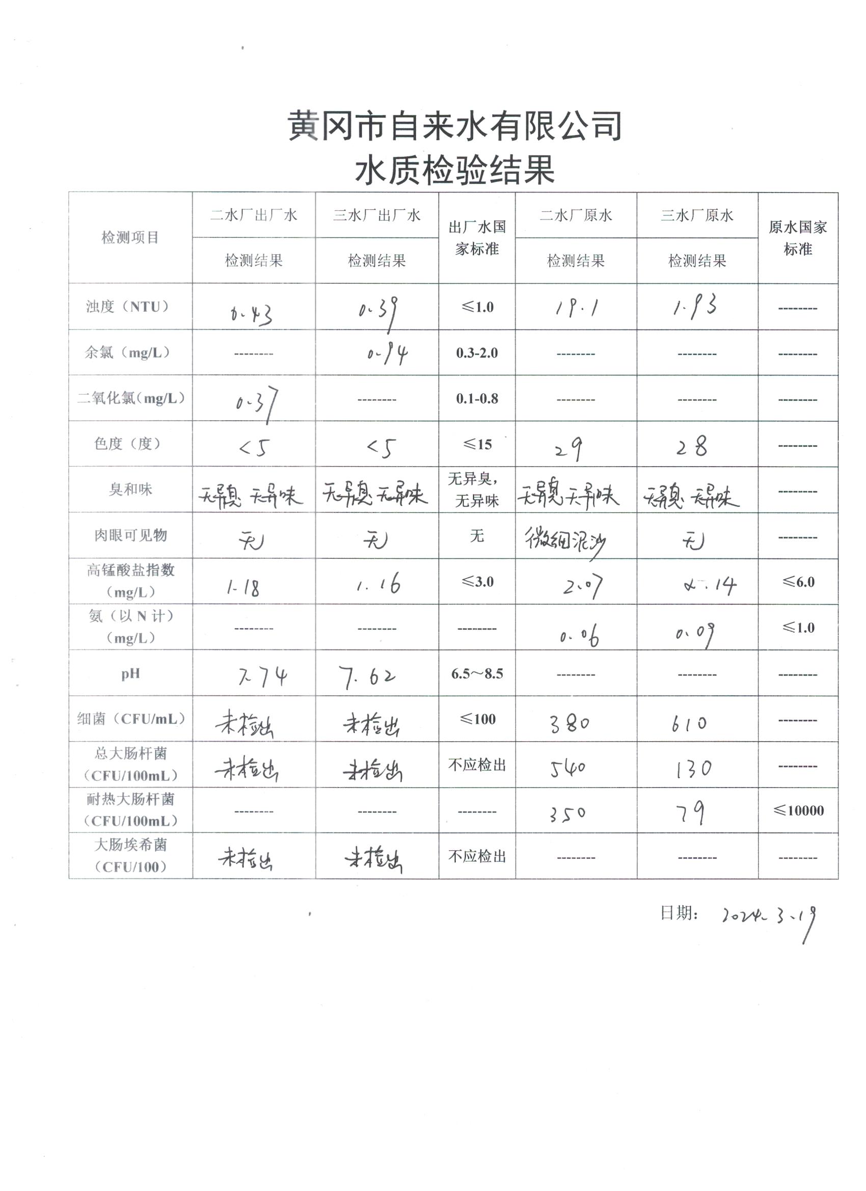 2024年3月19日水質(zhì)檢驗(yàn)日?qǐng)?bào)表