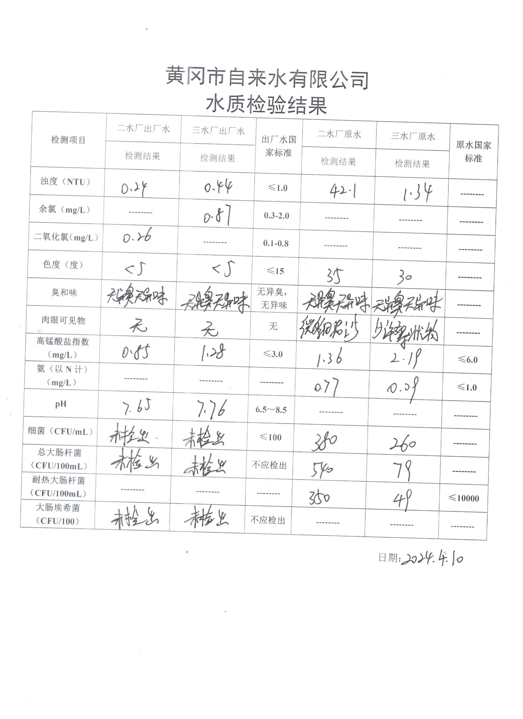 2024年4月10日水質(zhì)檢驗(yàn)日?qǐng)?bào)表