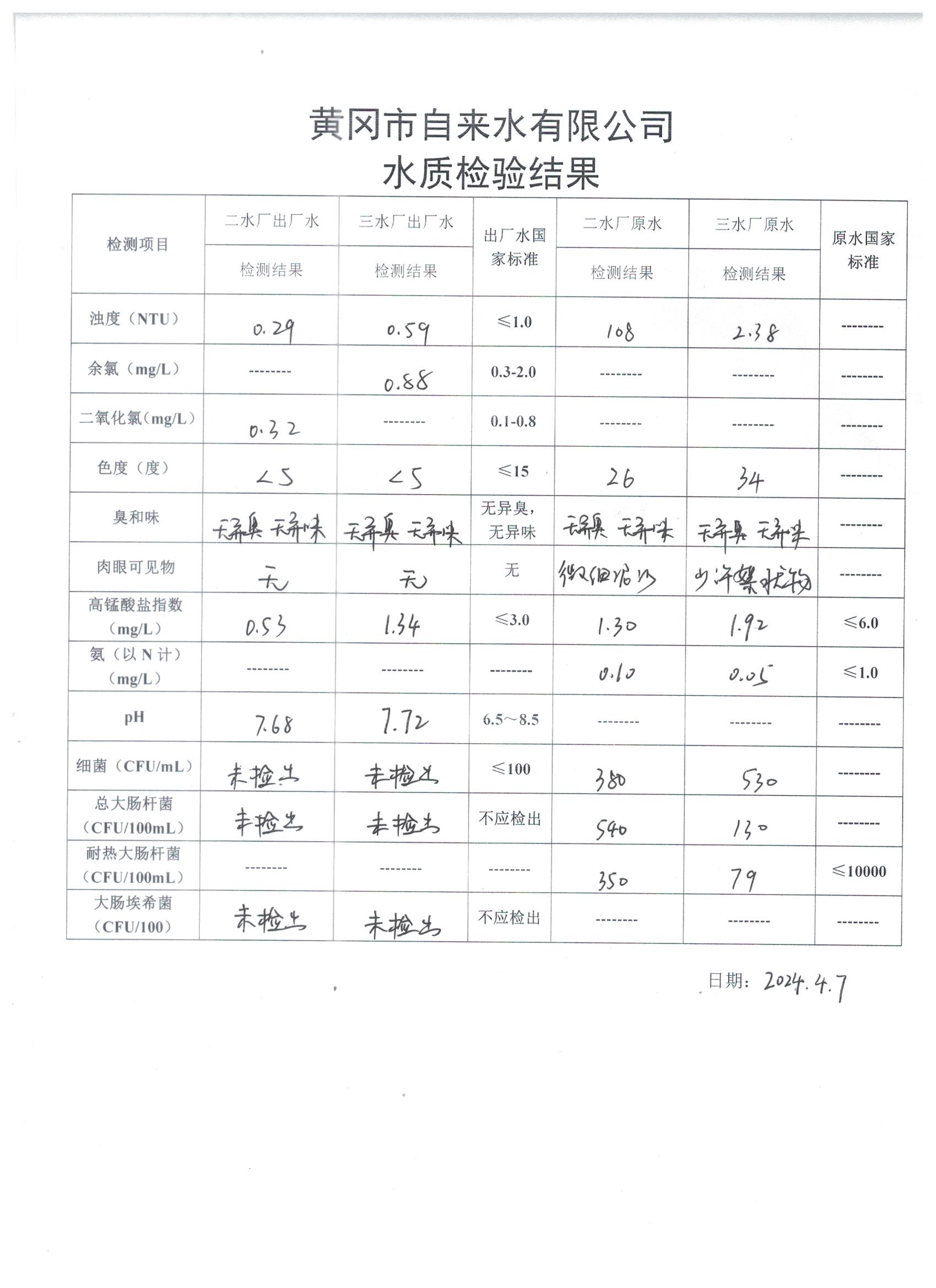 2024年4月7日水質(zhì)檢驗(yàn)日報(bào)表